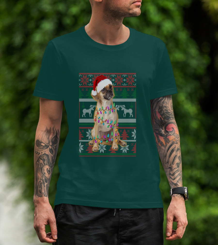 The Puggle Christmas Santa Hat with Holiday Lights T-shirt is designed for everyday wear and a consistent fit. Fabric is pre-shrunk ring-spun cotton with durable stitching. See the size chart below for exact measurements.