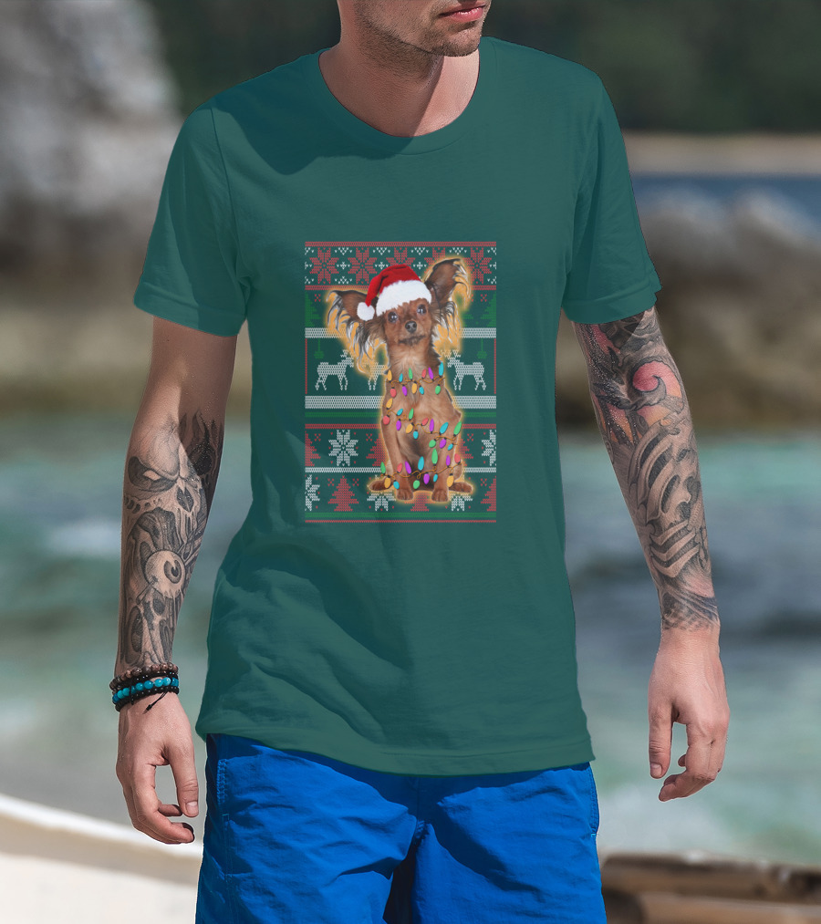 The Russian Toy Christmas Lights Santa Hat Reindeer Snowflakes T-shirt is designed for everyday wear and a consistent fit. Fabric is pre-shrunk ring-spun cotton with durable stitching. See the size chart below for exact measurements.