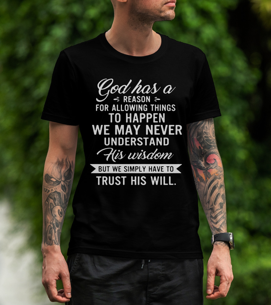 The God Has a Reason for Allowing Things to Happen We May Never Understand His Wisdom But We Simply Have to Trust His Will T-shirt is designed for everyday wear and a consistent fit. Fabric is pre-shrunk ring-spun cotton with durable stitching. See the size chart below for exact measurements.