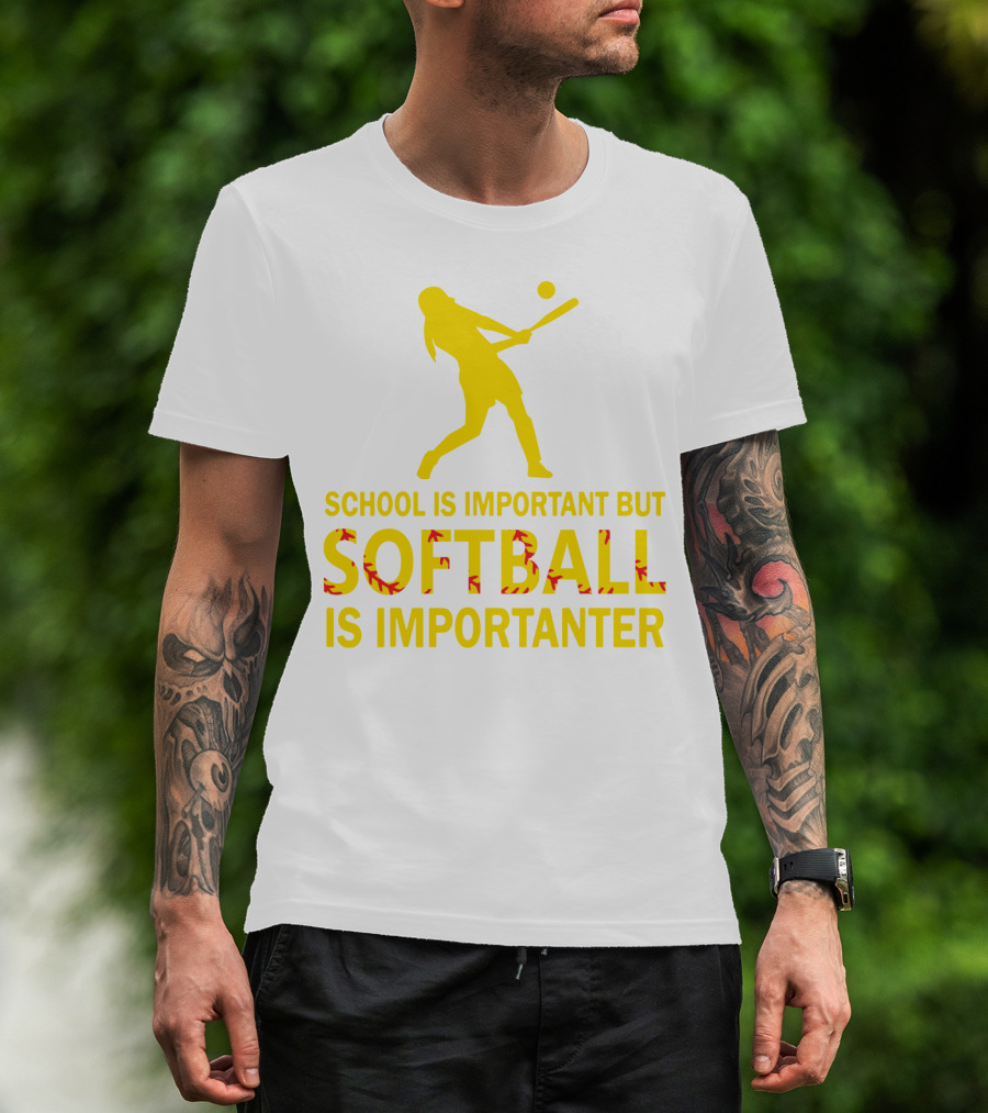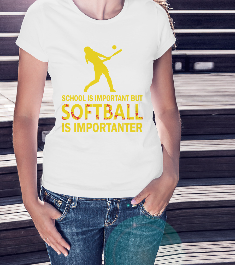 The School Is Important But Softball Is Importanter T-shirt is designed for everyday wear and a consistent fit. Fabric is pre-shrunk ring-spun cotton with durable stitching. See the size chart below for exact measurements.