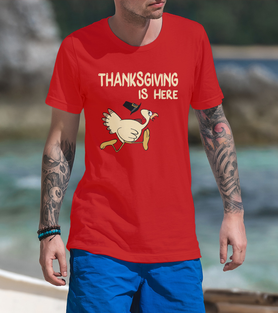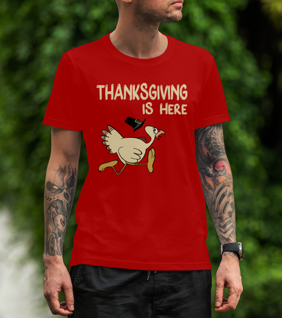 Thanksgiving Is Here Turkey With Pilgrim Hat On Red T-Shirt