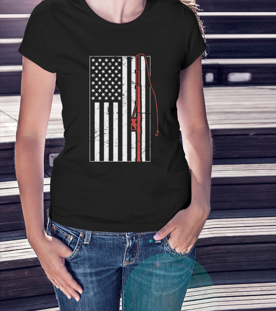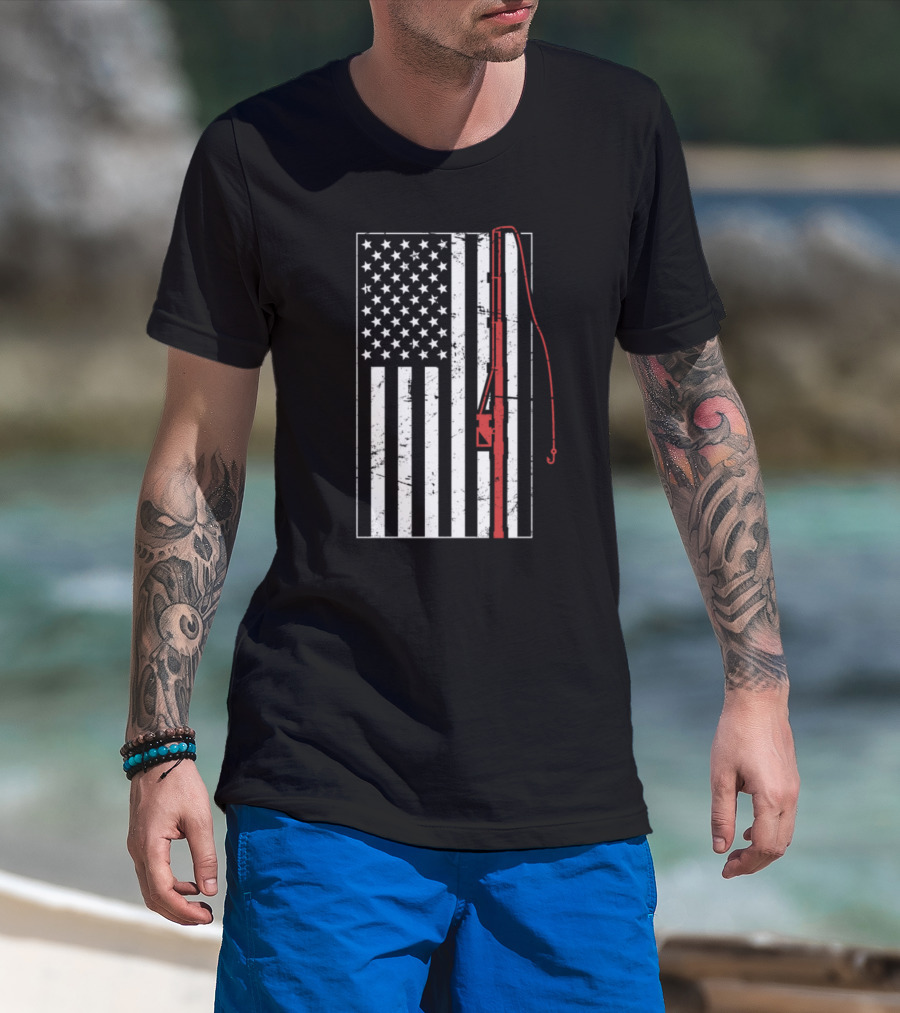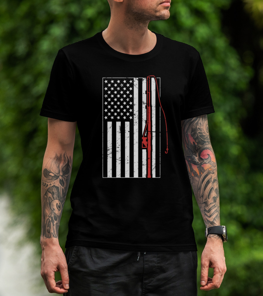 The American Flag Distressed Fishing Rod T-shirt is designed for everyday wear and a consistent fit. Fabric is pre-shrunk ring-spun cotton with durable stitching. See the size chart below for exact measurements.
