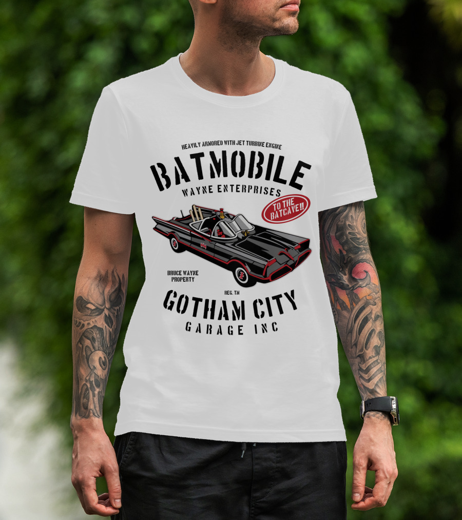The BATMOBILE Heavily Armored Jet Turbine Engine Wayne Enterprises Gotham City Garage Inc Bruce Wayne Property T-shirt is designed for everyday wear and a consistent fit. Fabric is pre-shrunk ring-spun cotton with durable stitching. See the size chart below for exact measurements.
