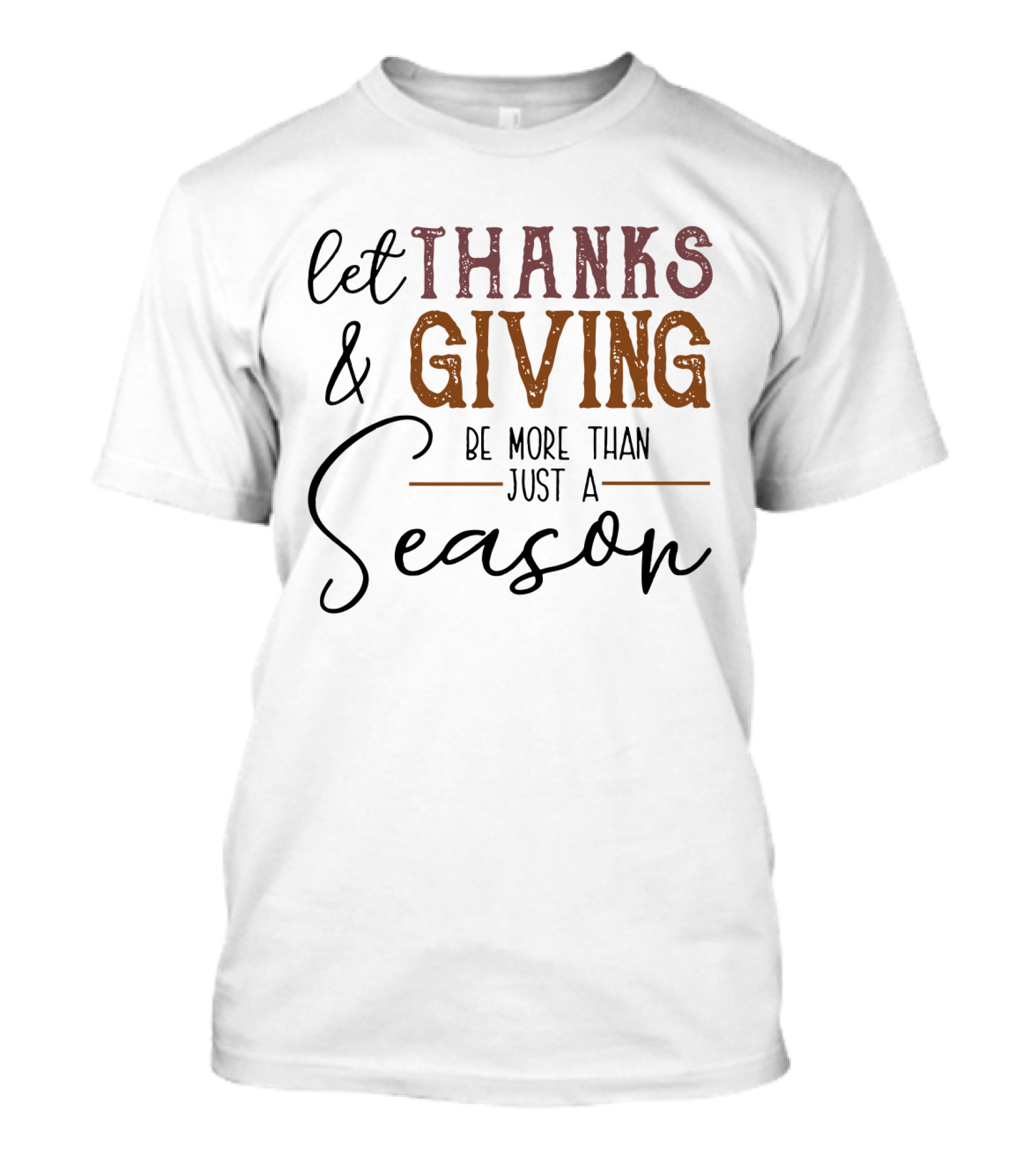 The Thanks and Giving Let It Be More Than Just a Season T-shirt is designed for everyday wear and a consistent fit. Fabric is pre-shrunk ring-spun cotton with durable stitching. See the size chart below for exact measurements.