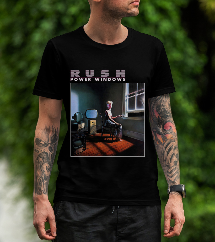 The Rush Power Windows Album Cover Art Vintage Television Room Scene T-shirt is designed for everyday wear and a consistent fit. Fabric is pre-shrunk ring-spun cotton with durable stitching. See the size chart below for exact measurements.