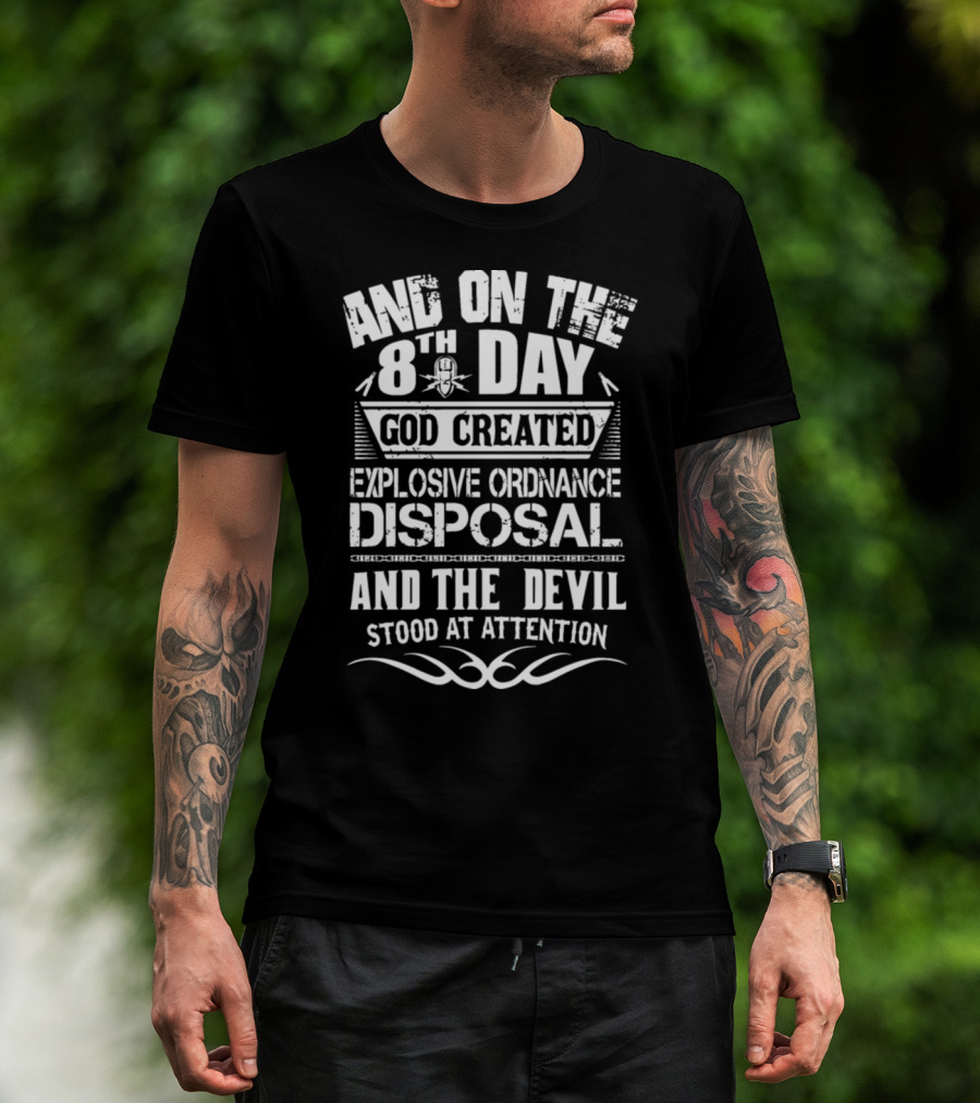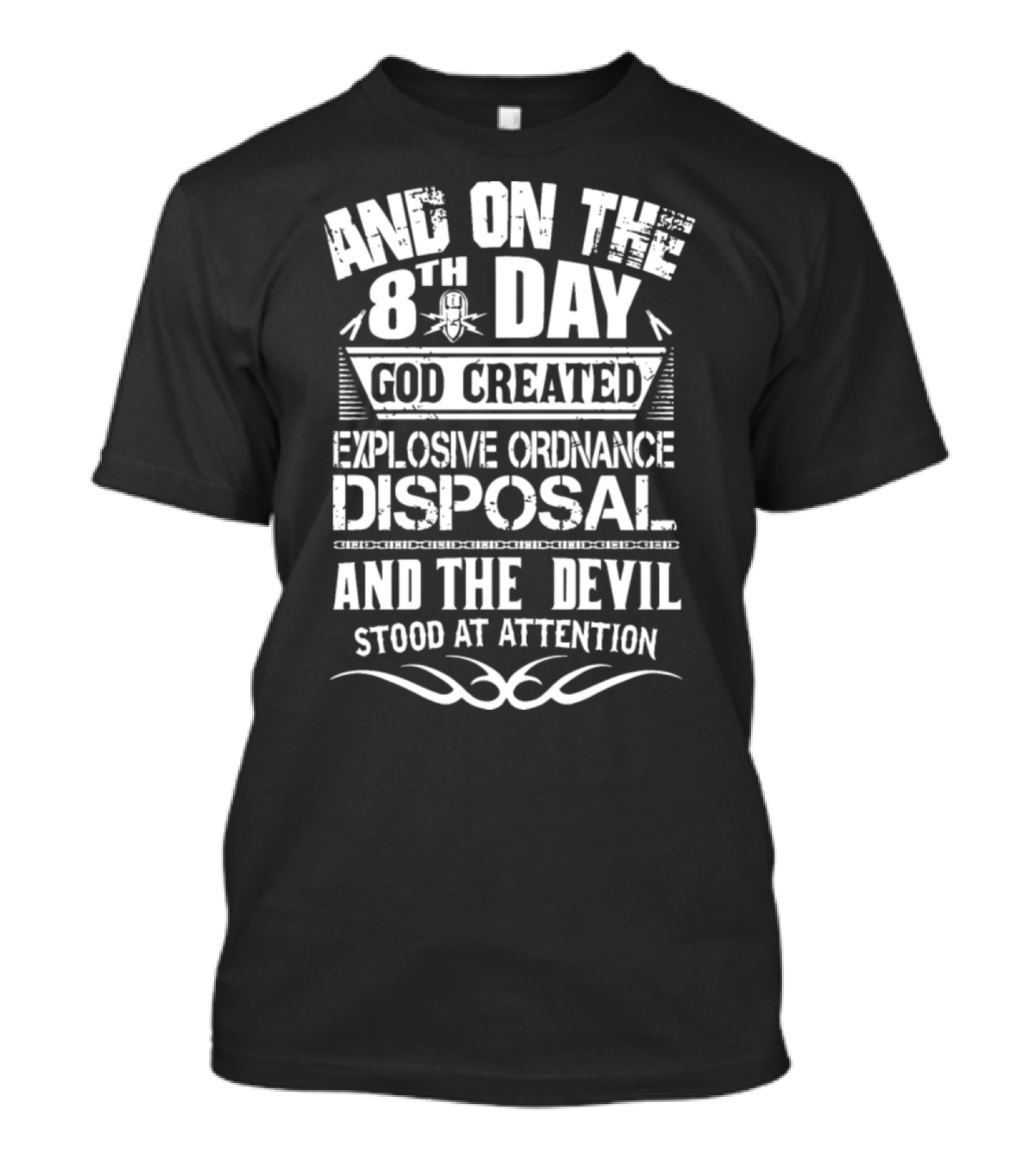 The AND ON THE 8TH DAY GOD CREATED EXPLOSIVE ORDNANCE DISPOSAL AND THE DEVIL STOOD AT ATTENTION T-shirt is designed for everyday wear and a consistent fit. Fabric is pre-shrunk ring-spun cotton with durable stitching. See the size chart below for exact measurements.