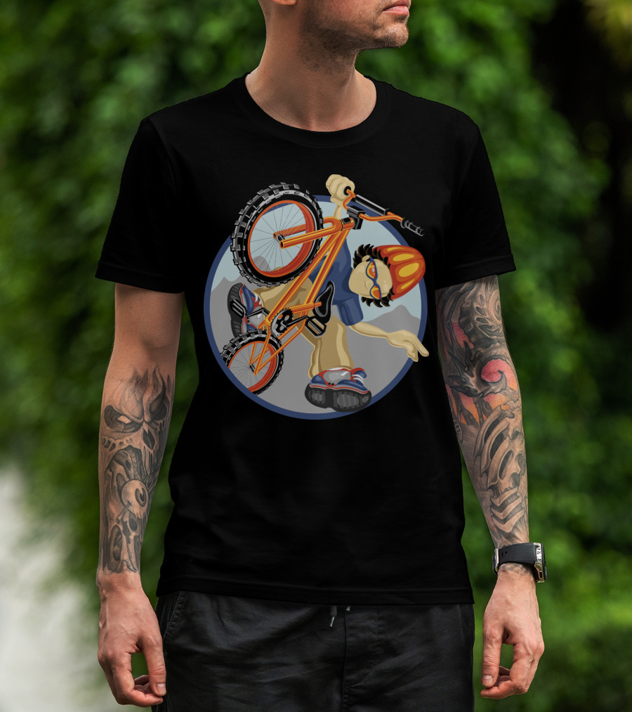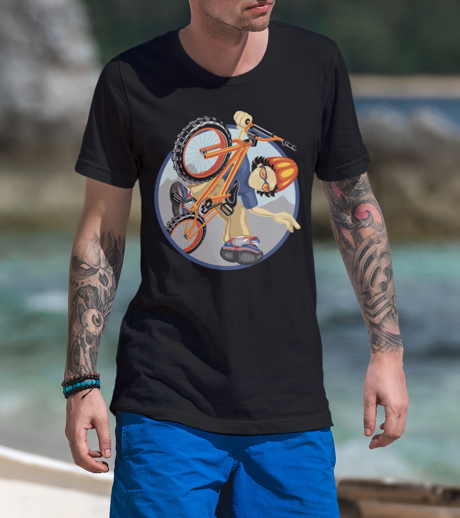 The BMX Boy Extreme Stunt Rider with Helmet and Sunglasses T-shirt is designed for everyday wear and a consistent fit. Fabric is pre-shrunk ring-spun cotton with durable stitching. See the size chart below for exact measurements.