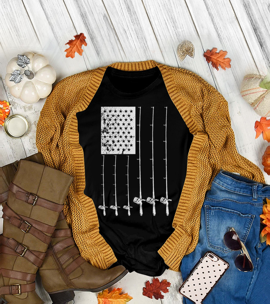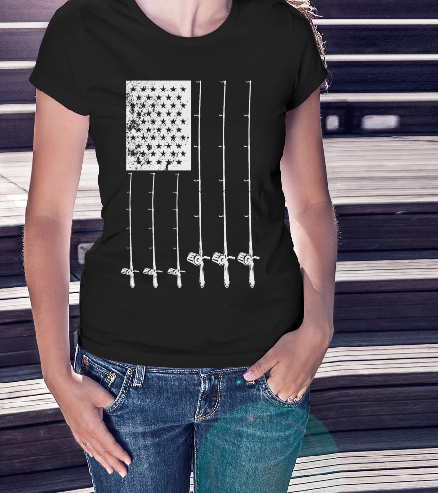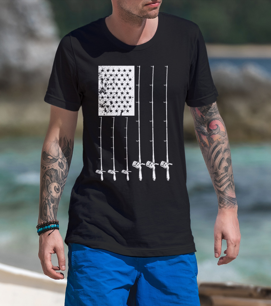 The Fishing Rods American Flag Stars T-shirt is designed for everyday wear and a consistent fit. Fabric is pre-shrunk ring-spun cotton with durable stitching. See the size chart below for exact measurements.