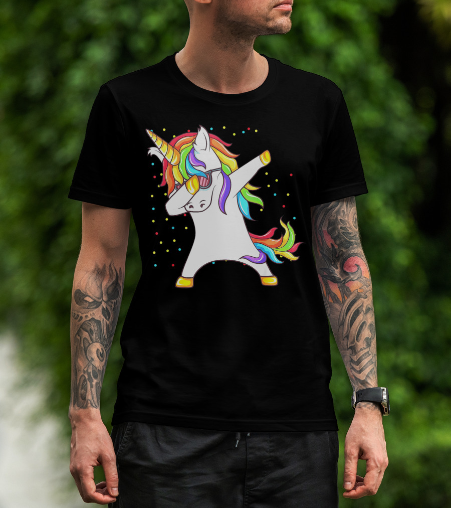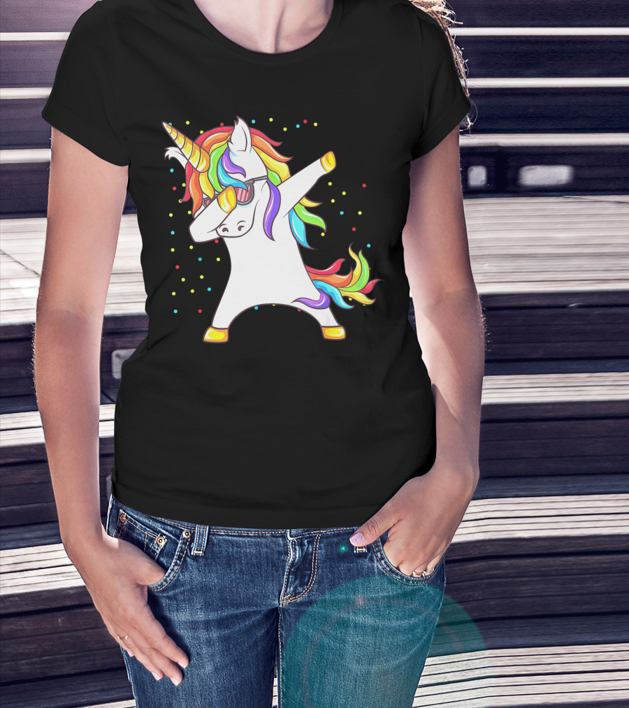 The Dabbing Unicorn Unicorn Dab Rainbow Mane T-shirt is designed for everyday wear and a consistent fit. Fabric is pre-shrunk ring-spun cotton with durable stitching. See the size chart below for exact measurements.