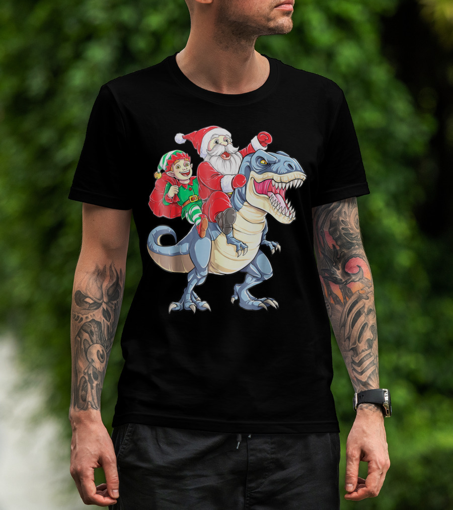 Dinosaur Christmas Santa And Elf Riding T-Rex T-Shirt