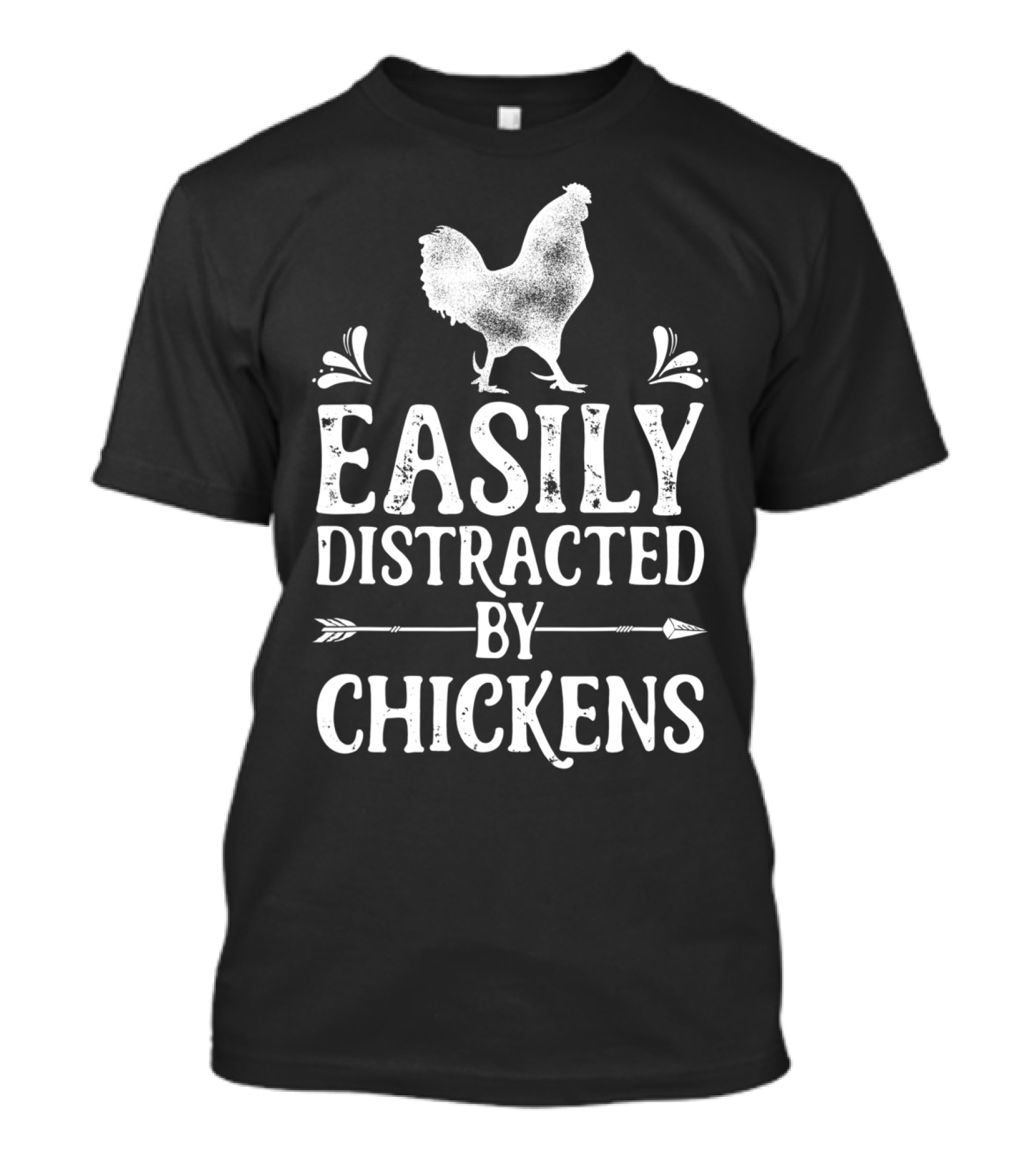 The Easily Distracted By Chickens Funny Chicken Lover Rooster T-shirt is designed for everyday wear and a consistent fit. Fabric is pre-shrunk ring-spun cotton with durable stitching. See the size chart below for exact measurements.