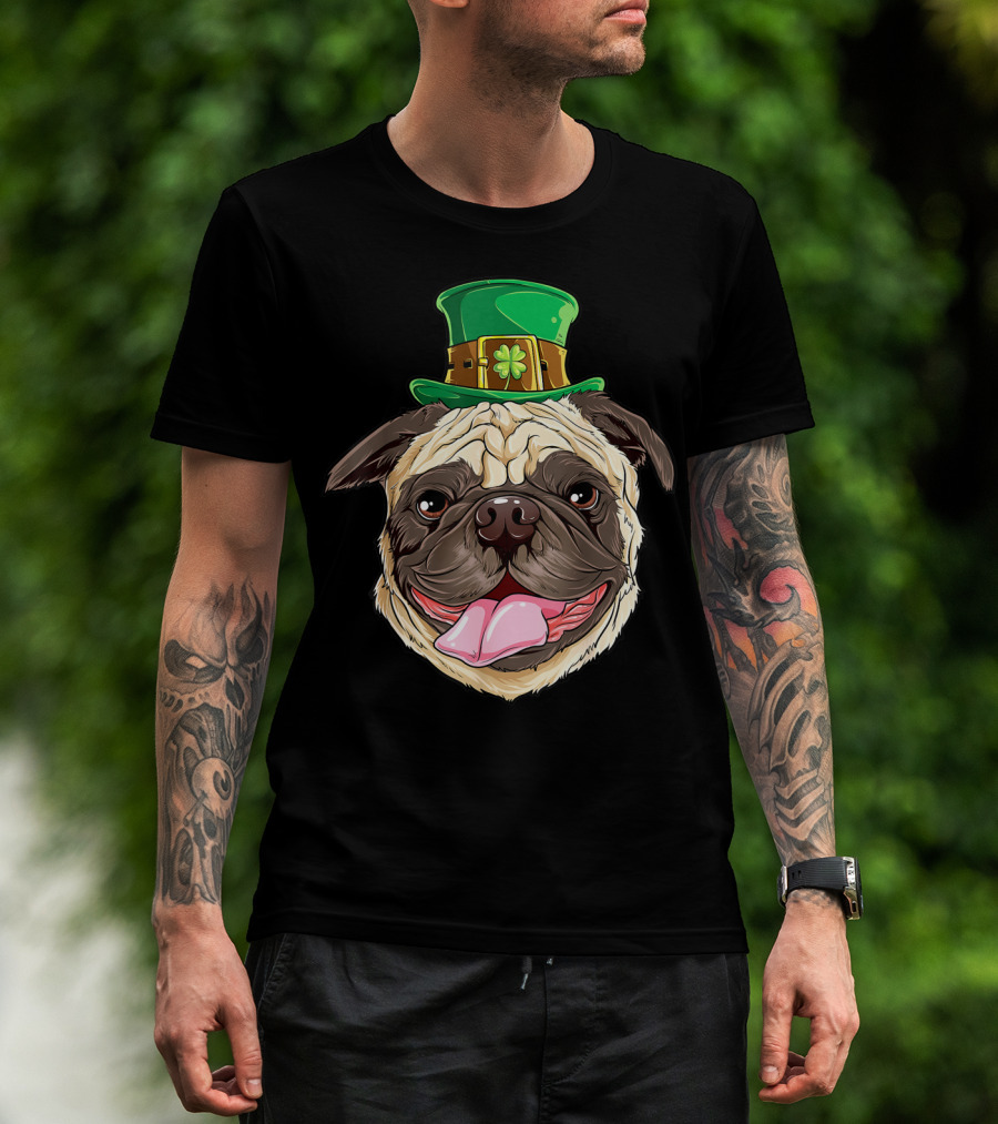 Irish Pug Wearing Leprechaun Hat With Shamrock T-Shirt