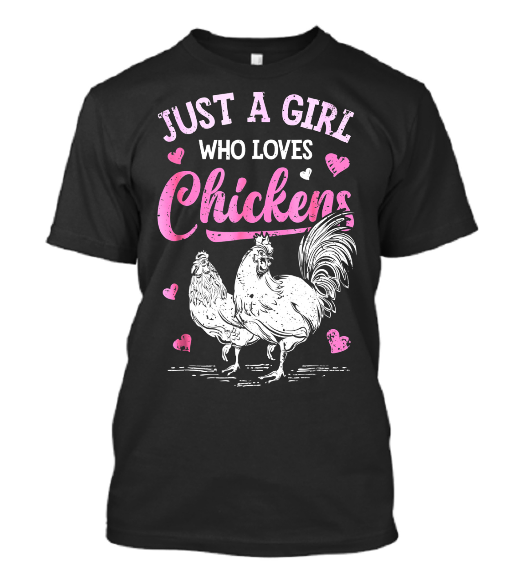 The Just a Girl Who Loves Chickens with Heart Accents and Rooster Hen T-shirt is designed for everyday wear and a consistent fit. Fabric is pre-shrunk ring-spun cotton with durable stitching. See the size chart below for exact measurements.