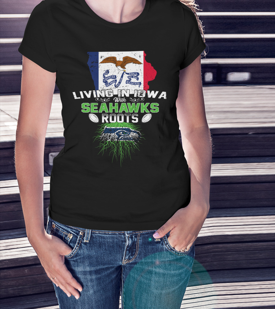 Living In Iowa With Seahawks Roots Flag And Football Elements T-Shirt