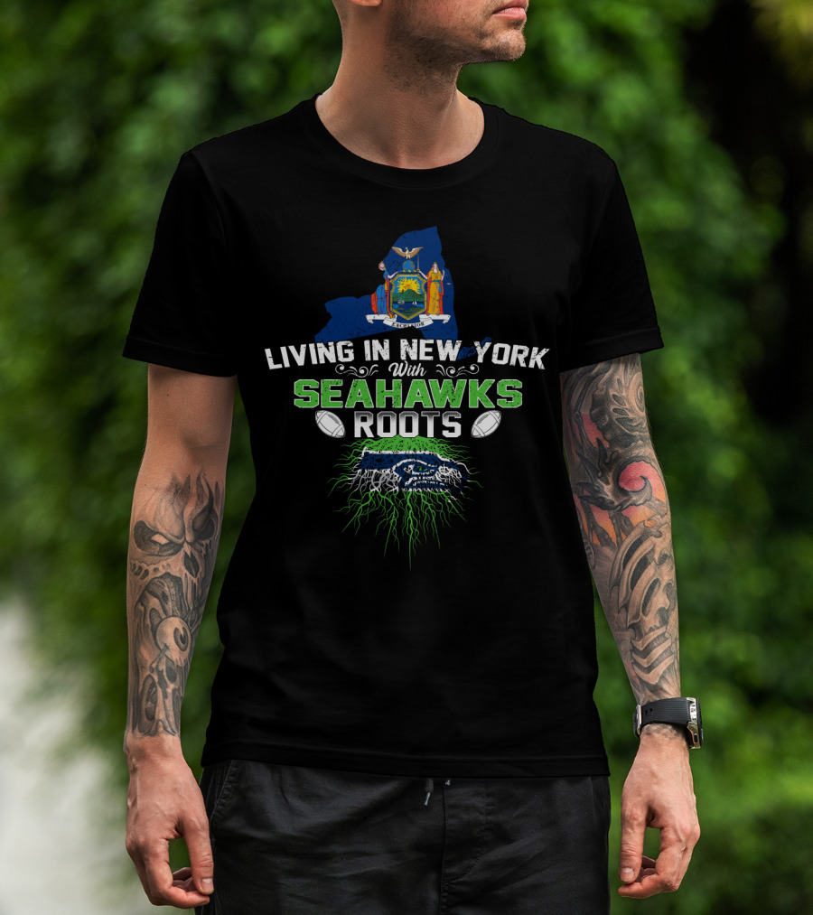 The LIVING IN NEW YORK WITH SEAHAWKS ROOTS FOOTBALL PRIDE STATE FLAG BACKGROUND T-shirt is designed for everyday wear and a consistent fit. Fabric is pre-shrunk ring-spun cotton with durable stitching. See the size chart below for exact measurements.