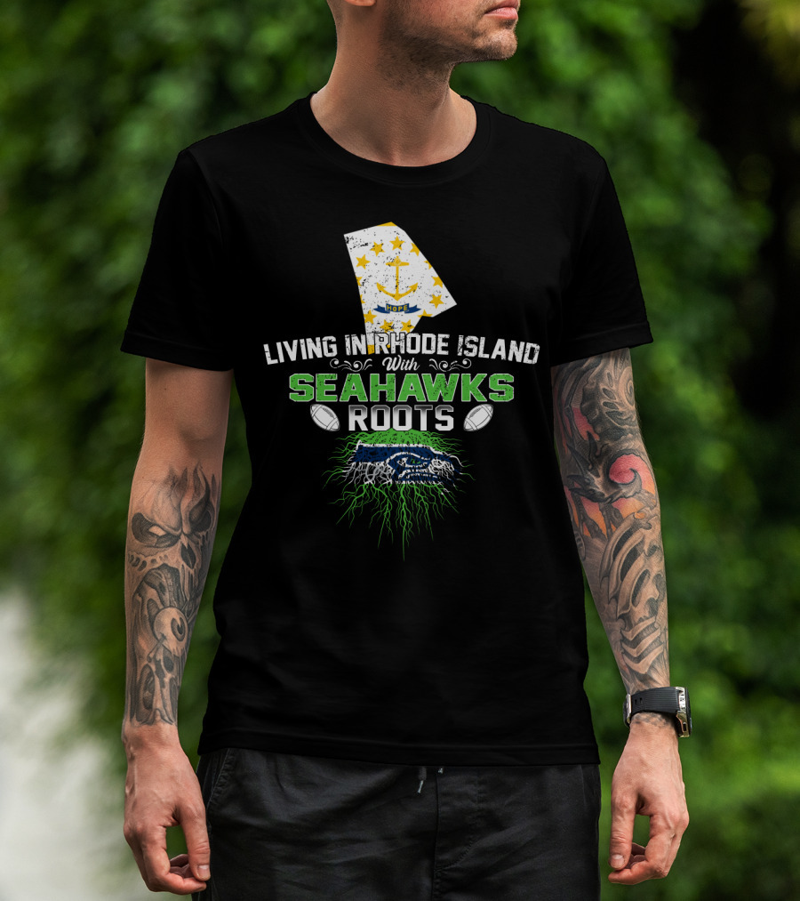 Living In Rhode Island With Seahawks Roots Featuring Rhode Island Flag And Fierce Seahawk Emblem T-Shirt