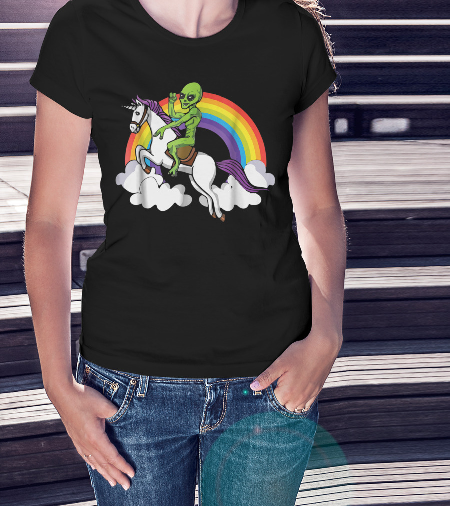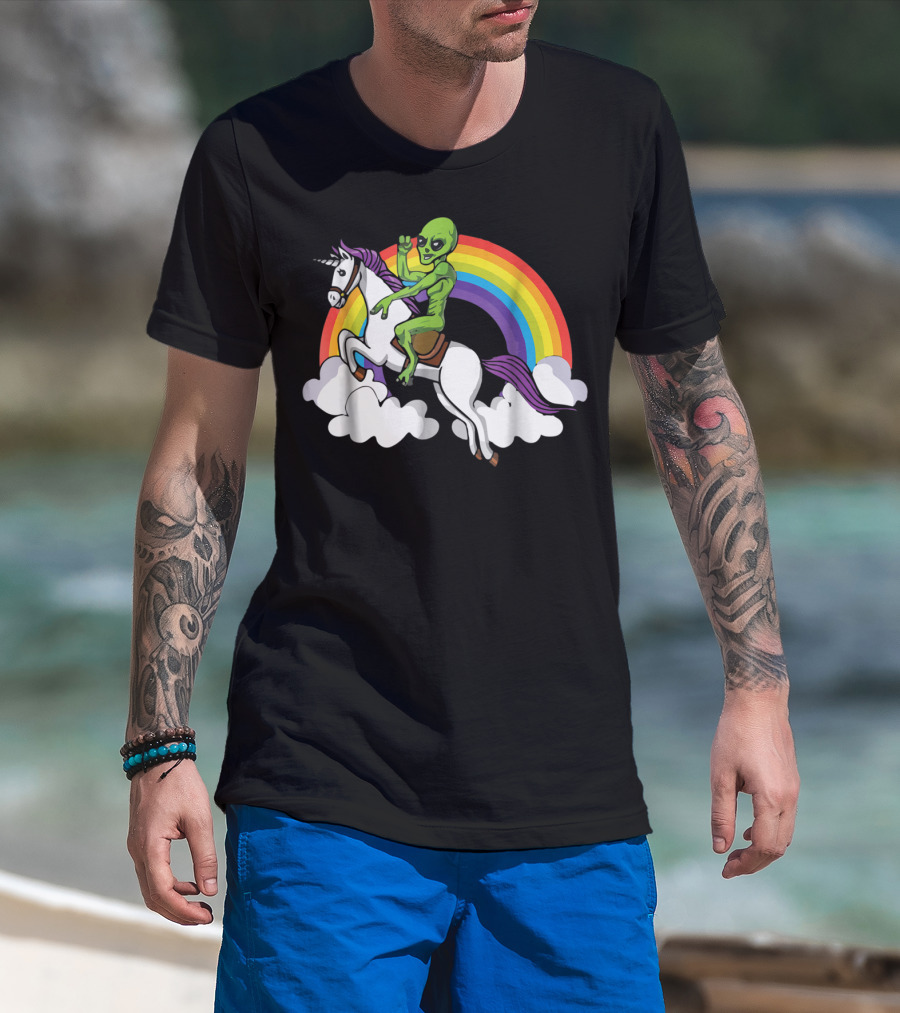 The Alien Riding Unicorn T-shirt is designed for everyday wear and a consistent fit. Fabric is pre-shrunk ring-spun cotton with durable stitching. See the size chart below for exact measurements.