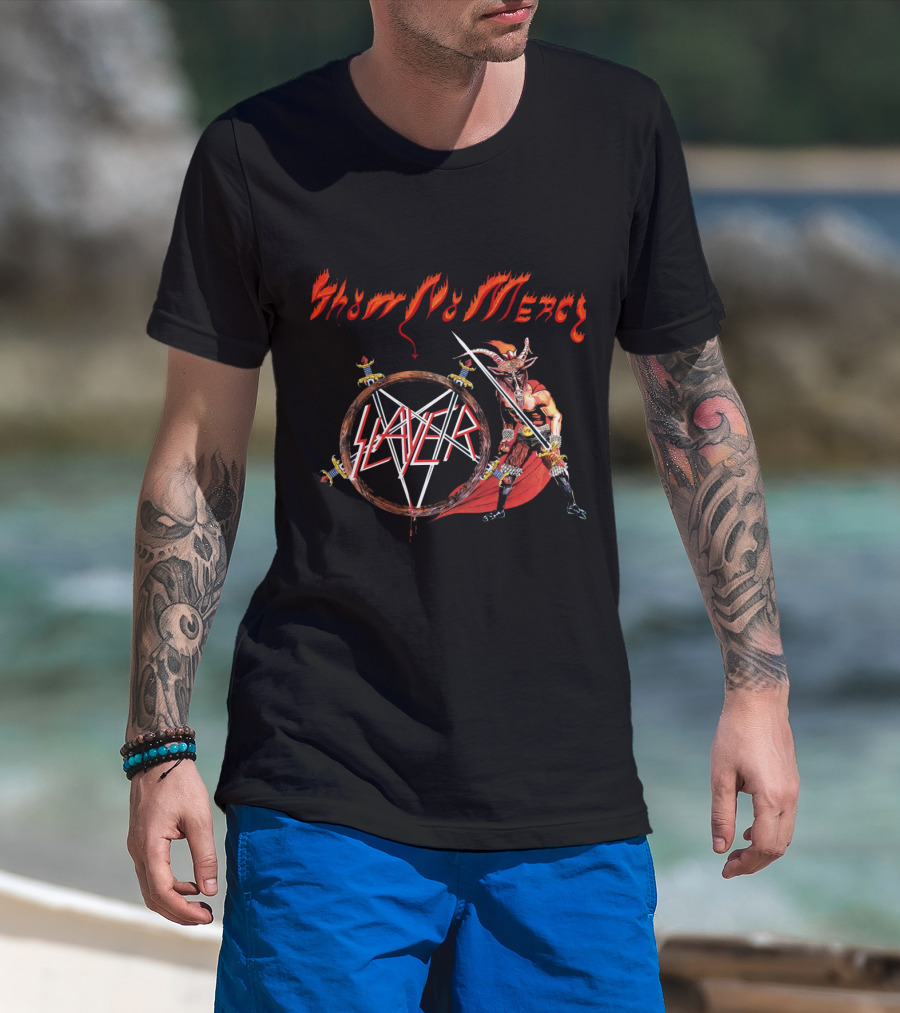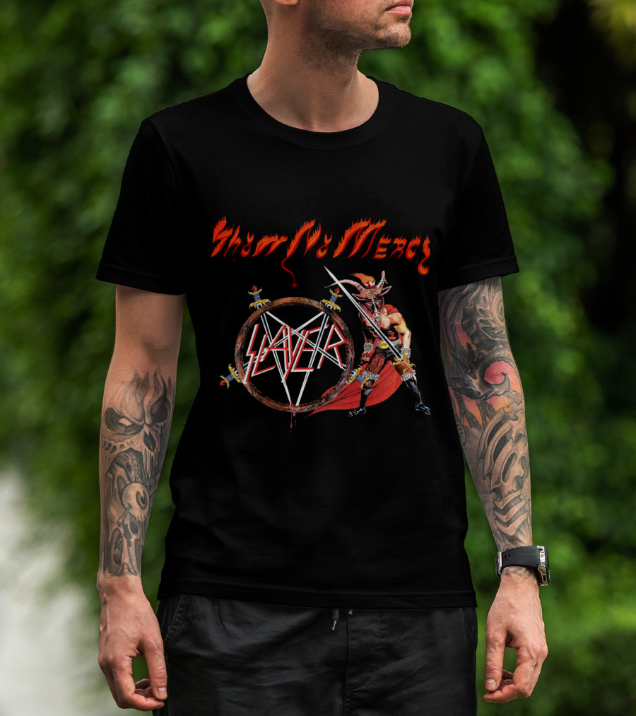 The Slayer Show No Mercy Pentagram Sword Demon Icon T-shirt is designed for everyday wear and a consistent fit. Fabric is pre-shrunk ring-spun cotton with durable stitching. See the size chart below for exact measurements.