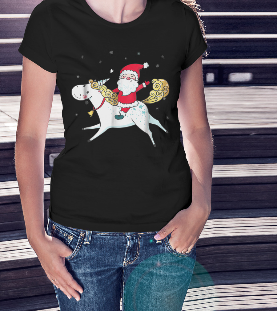 Funny Santa Claus Riding A Unicorn Christmas Noel T-Shirt