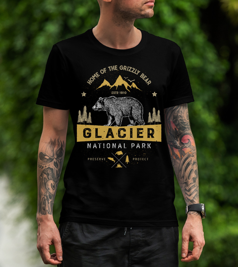 The Home of the Grizzly Bear Glacier National Park ESTP 1910 Preserve Protect Vintage Montana Bear T-shirt is designed for everyday wear and a consistent fit. Fabric is pre-shrunk ring-spun cotton with durable stitching. See the size chart below for exact measurements.