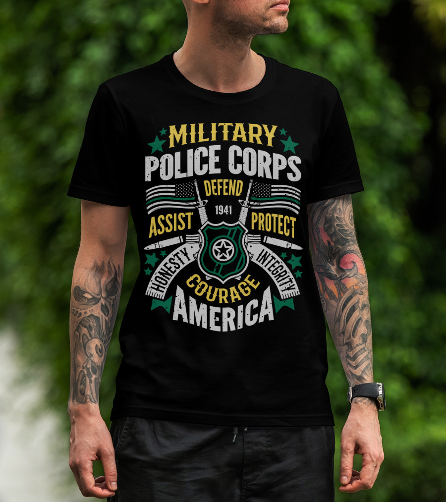 The Military Police Corps Defend Assist Protect Honesty Courage Integrity America 1941 T-shirt is designed for everyday wear and a consistent fit. Fabric is pre-shrunk ring-spun cotton with durable stitching. See the size chart below for exact measurements.