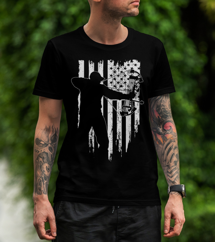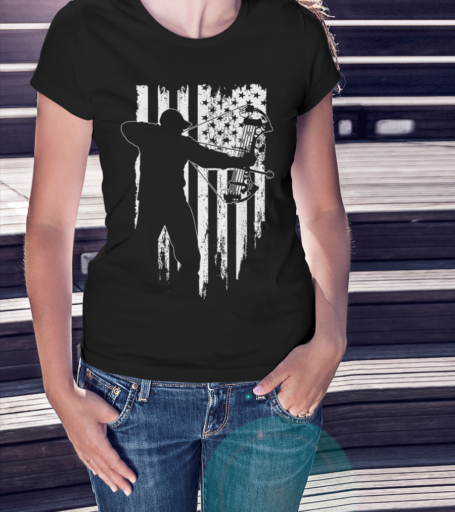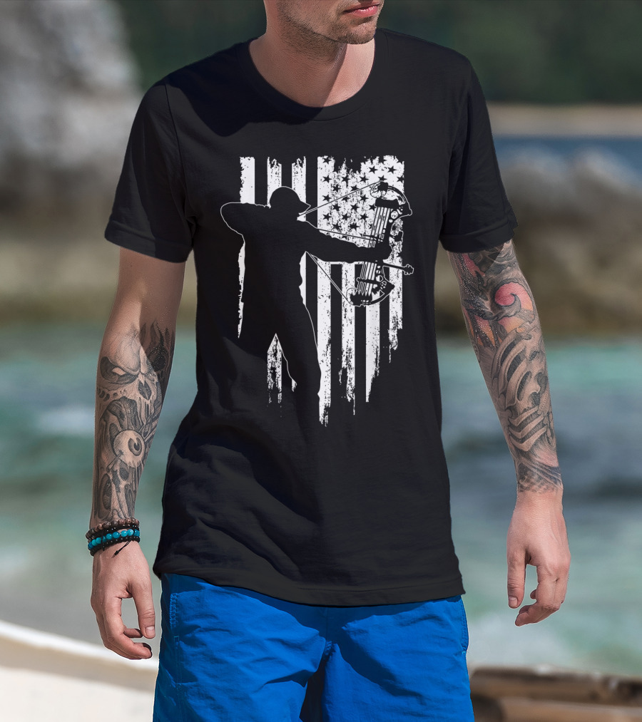 American Patriotic Archer Silhouette With Compound Bow And Flag T-Shirt