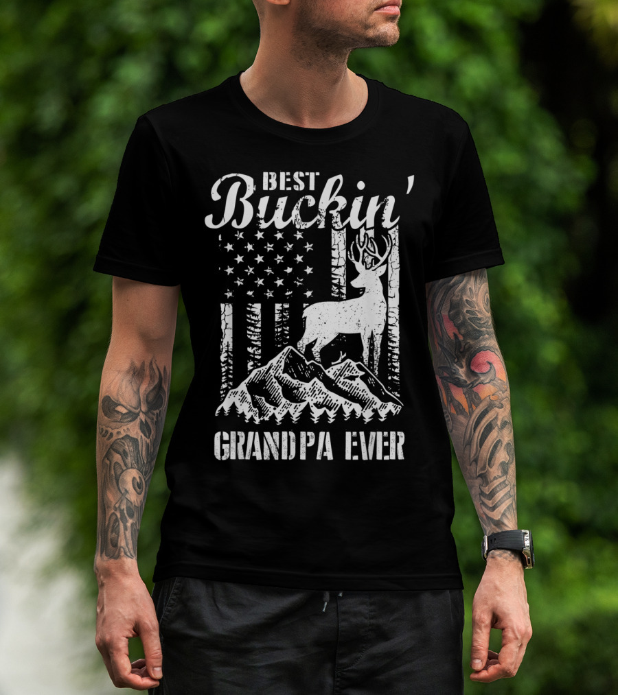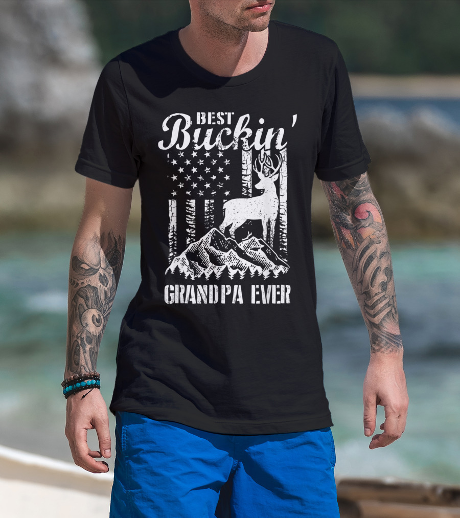 Best Buckin' Grandpa Ever Deer Hunting Father Mountains American Flag T-Shirt