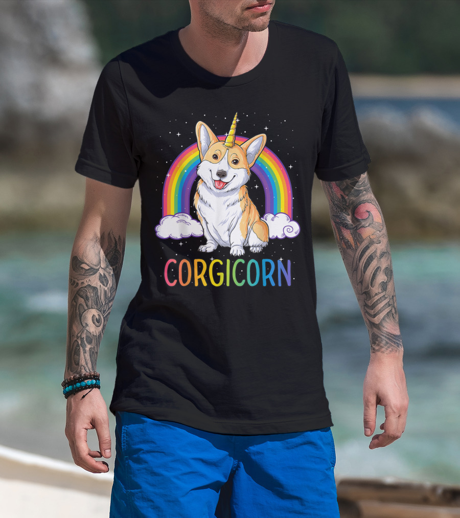 The Corgicorn Corgi Unicorn Rainbow Galaxy Stars Clouds T-shirt is designed for everyday wear and a consistent fit. Fabric is pre-shrunk ring-spun cotton with durable stitching. See the size chart below for exact measurements.