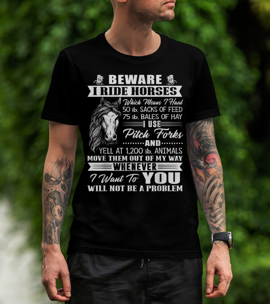 Beware I Ride Horses Haul Sacks Of Feed Bales Of Hay Pitch Forks Yell Animals Move Whenever I Want You Will Not Be A Problem T-Shirt