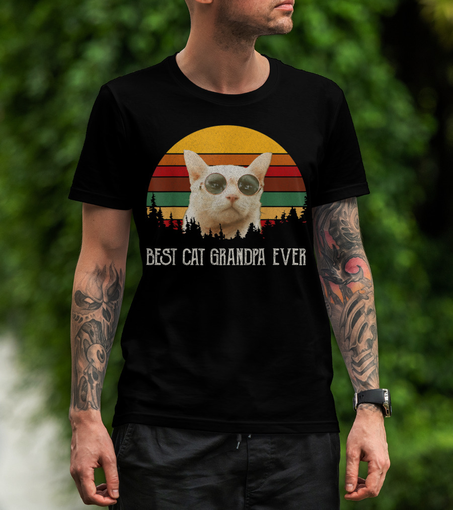 Best Cat Grandpa Ever Retro Cat With Sunglasses And Trees Vintage Sunset T-Shirt