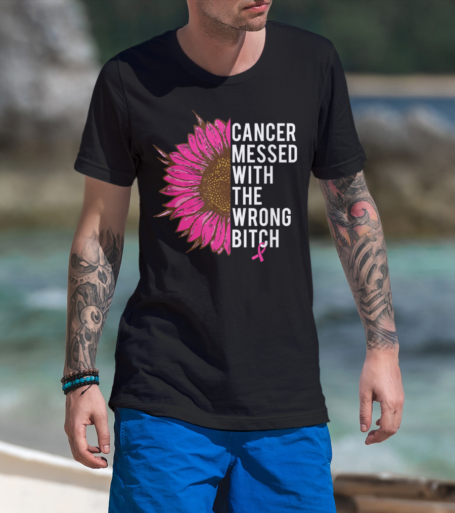Cancer Messed With The Wrong Bitch Pink Ribbon Sunflower T-Shirt
