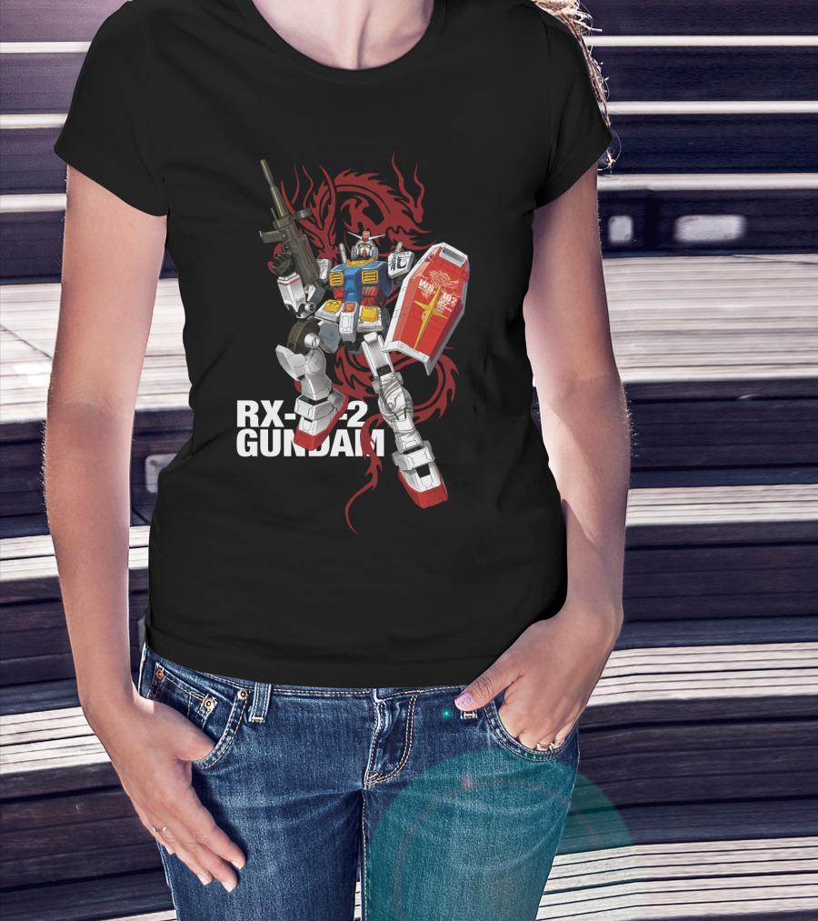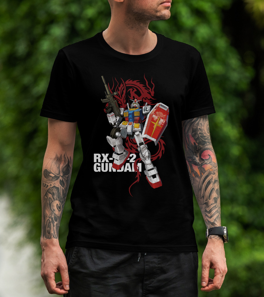 The RX 78 2 Gundam Mobile Suit with Red Dragon Background T-shirt is designed for everyday wear and a consistent fit. Fabric is pre-shrunk ring-spun cotton with durable stitching. See the size chart below for exact measurements.