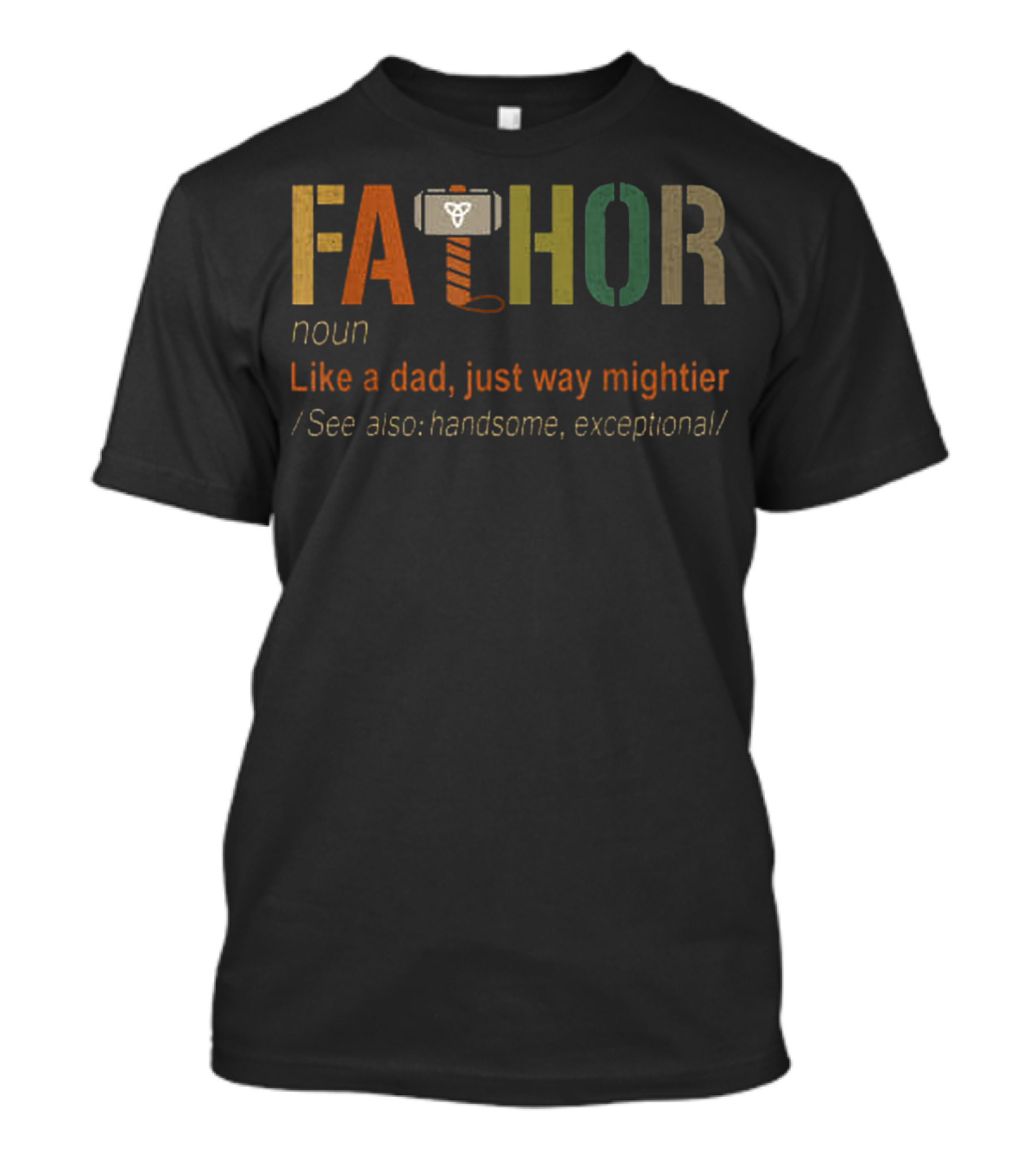 The Fathor Noun Like a Dad Just Way Mightier See Also Handsome Exceptional with Hammer Motif T-shirt is designed for everyday wear and a consistent fit. Fabric is pre-shrunk ring-spun cotton with durable stitching. See the size chart below for exact measurements.