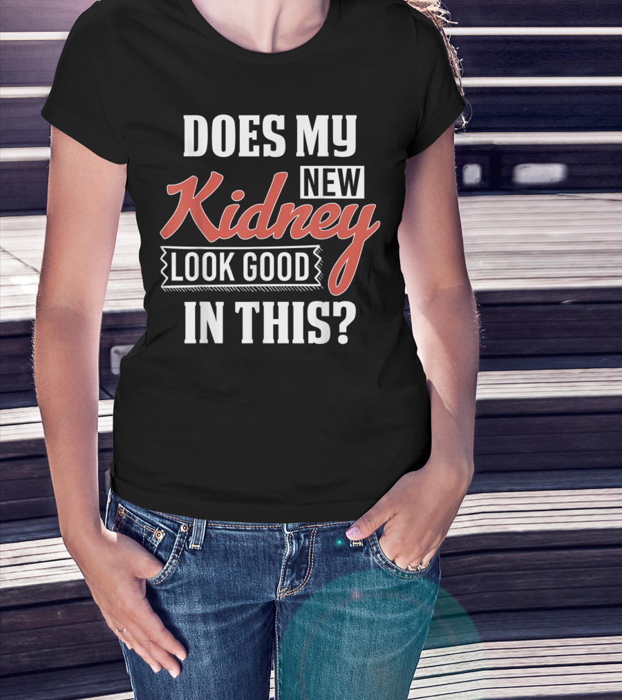 The Does My New Kidney Look Good In This T-shirt is designed for everyday wear and a consistent fit. Fabric is pre-shrunk ring-spun cotton with durable stitching. See the size chart below for exact measurements.