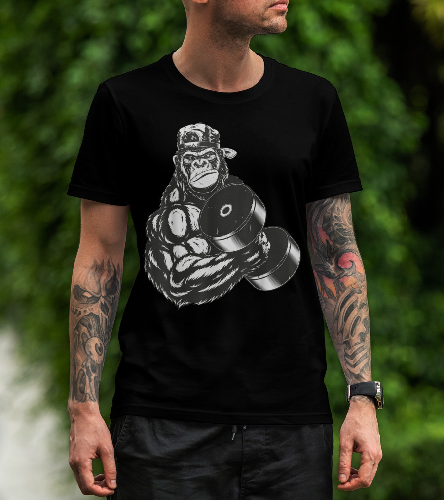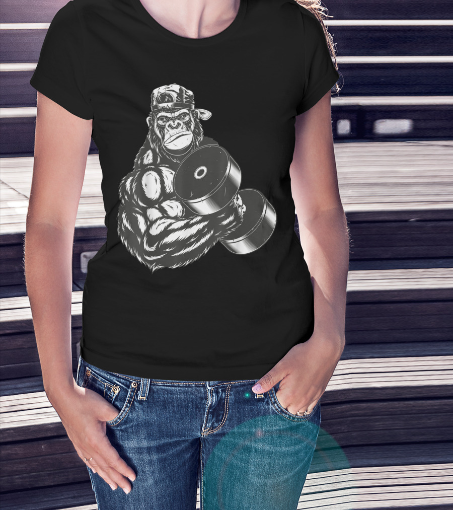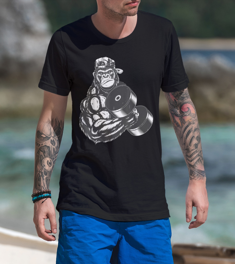 Ferocious Gorilla Bodybuilder Lifting Large Dumbbell In Cap T-Shirt