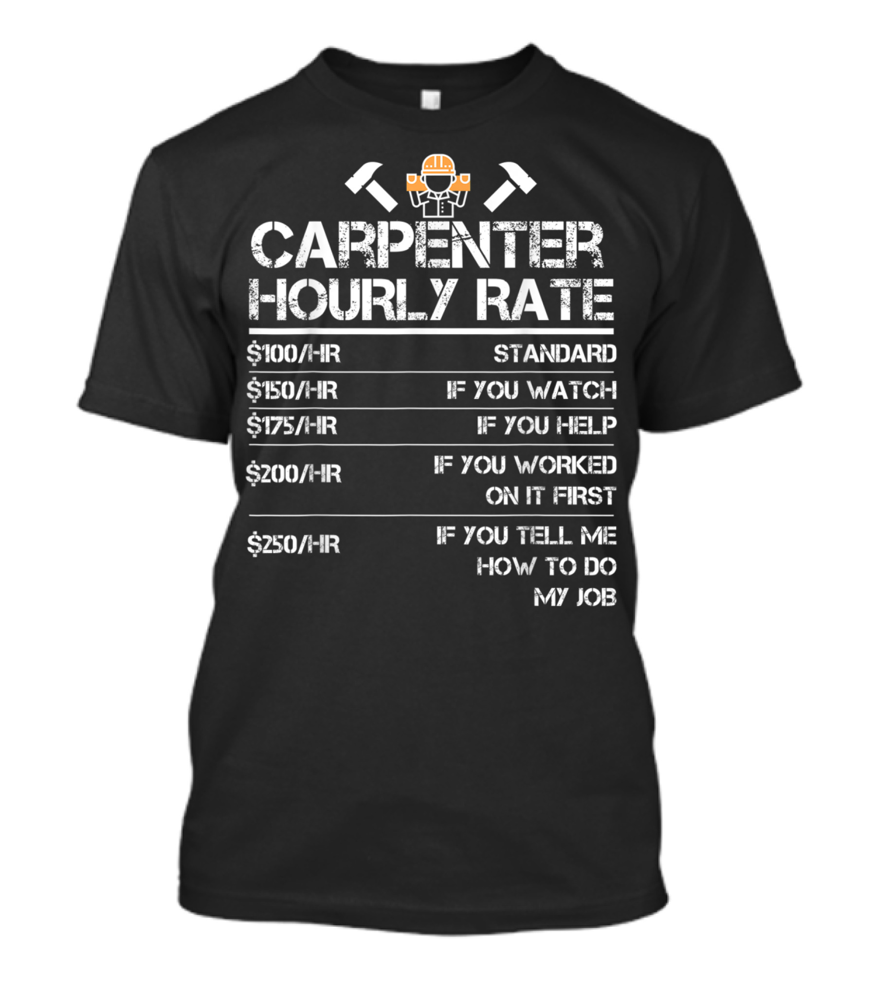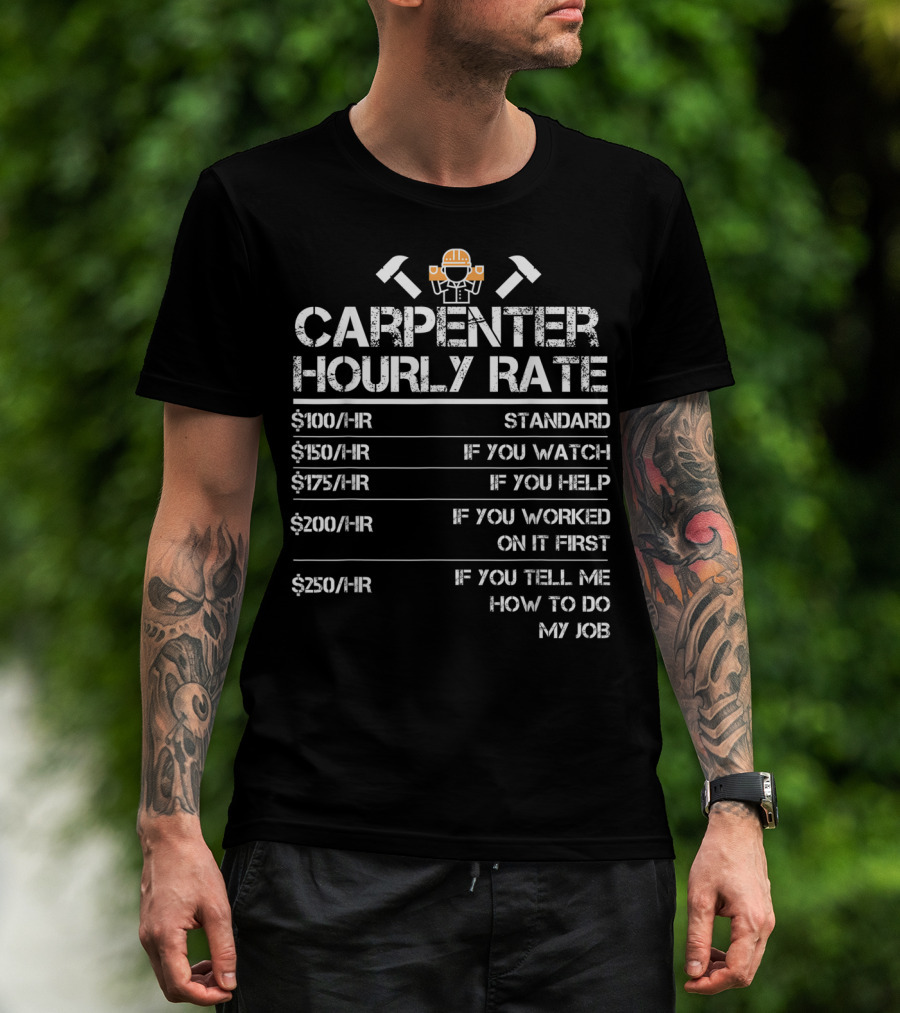 The Funny Carpenter Hourly Rate Wood Working Carpenter Hourly Rate Standard If You Watch If You Help If You Worked On It First If You Tell Me How To Do My Job T-shirt is designed for everyday wear and a consistent fit. Fabric is pre-shrunk ring-spun cotton with durable stitching. See the size chart below for exact measurements.