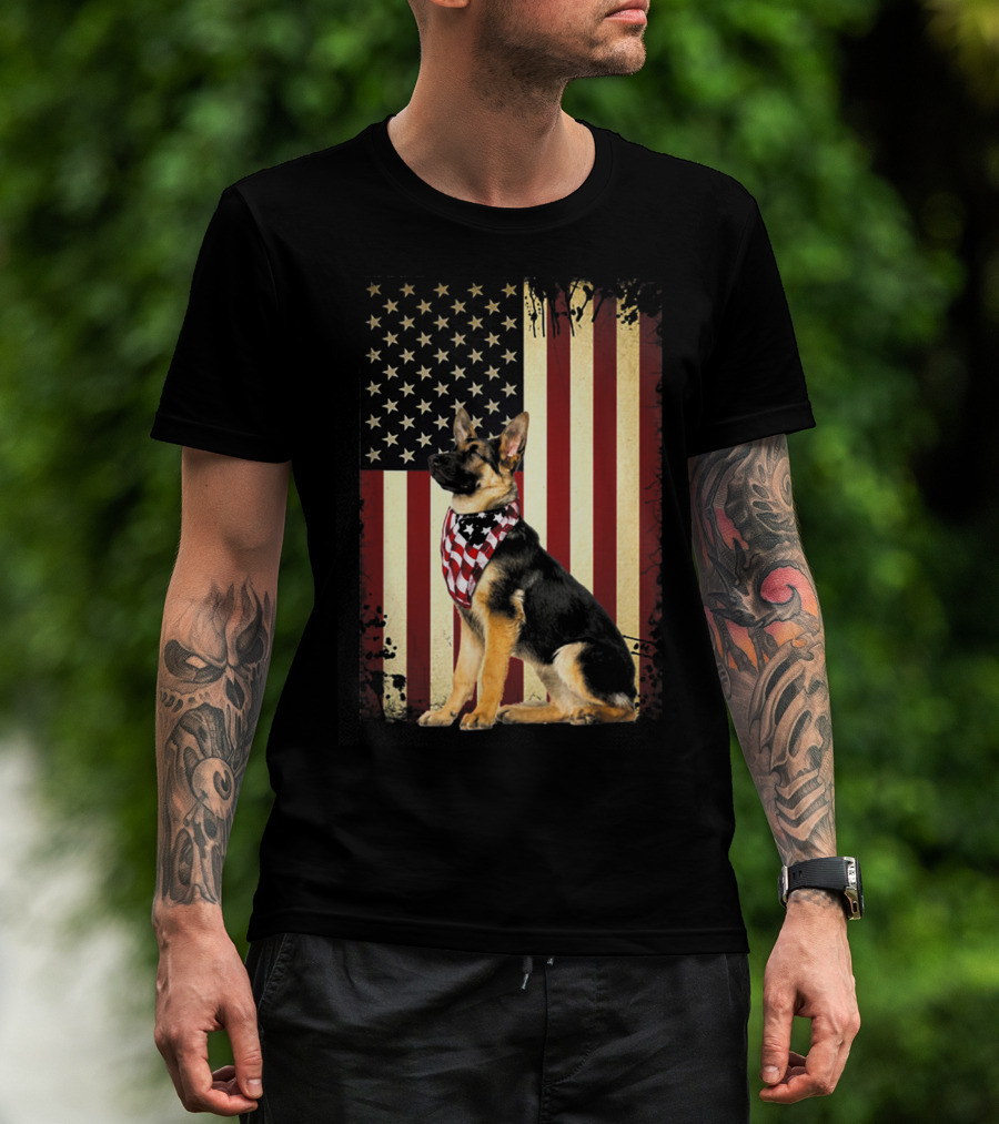 German Shepherd With American Flag Bandana In Front Of Stars And Stripes Flag T-Shirt