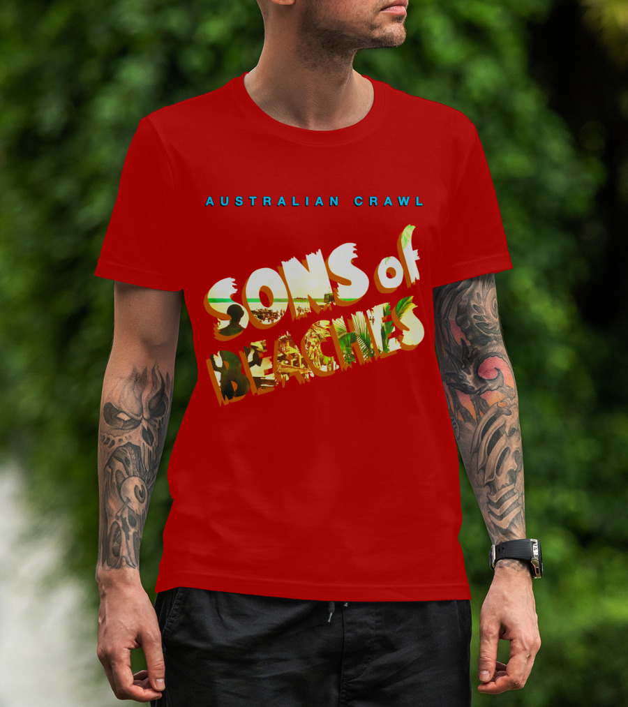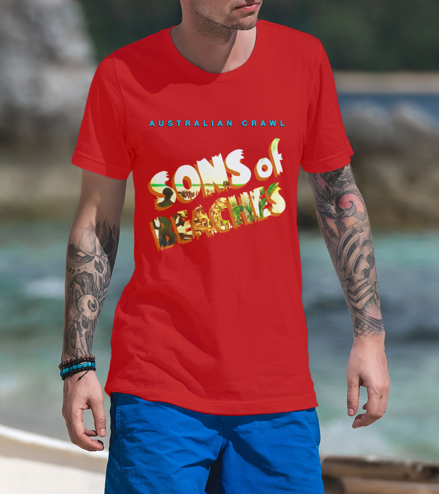 The Australian Crawl Sons of Beaches T-shirt is designed for everyday wear and a consistent fit. Fabric is pre-shrunk ring-spun cotton with durable stitching. See the size chart below for exact measurements.