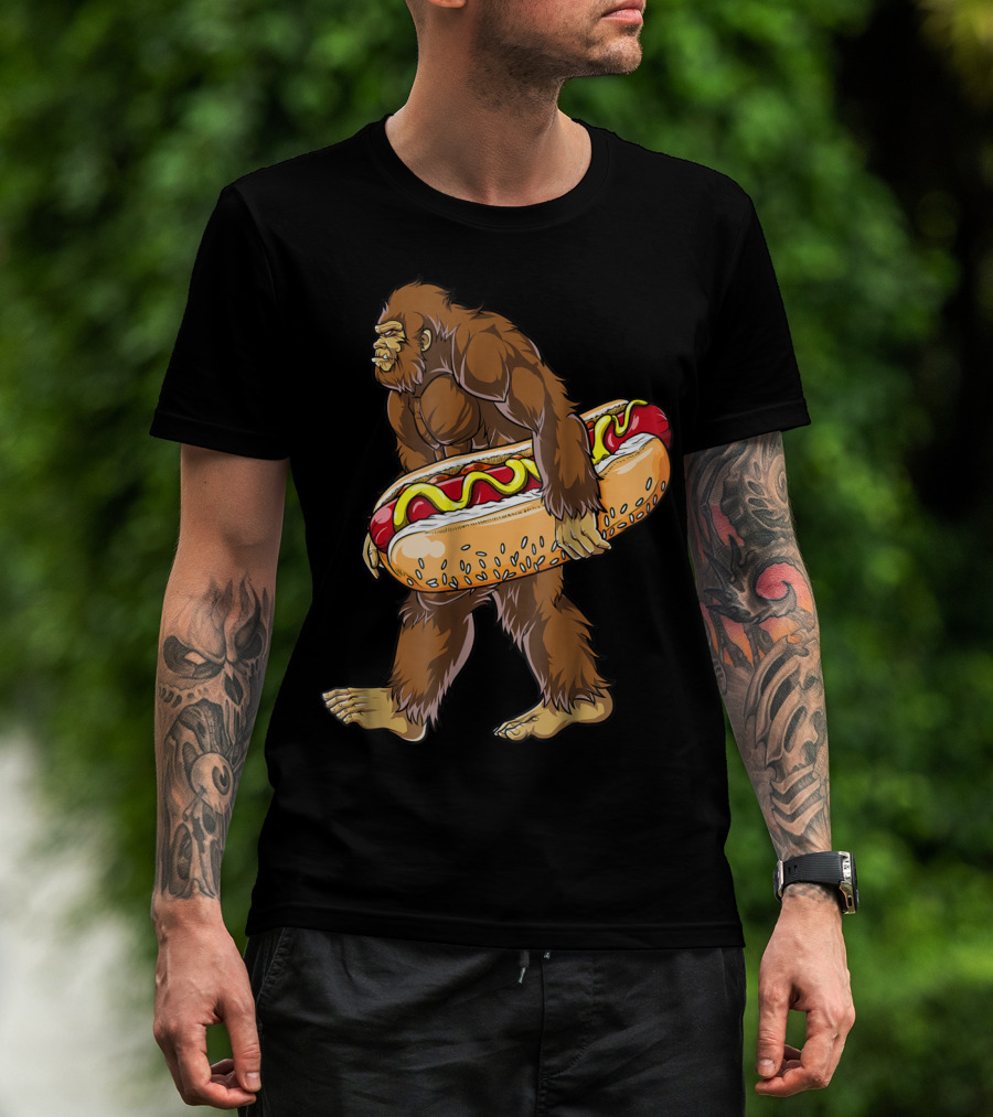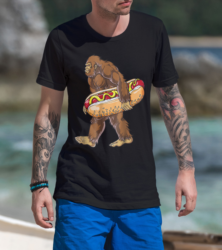 Bigfoot Carrying Giant Hotdog Sasquatch Food Lovers T-Shirt
