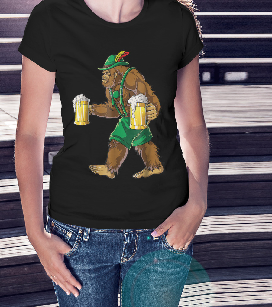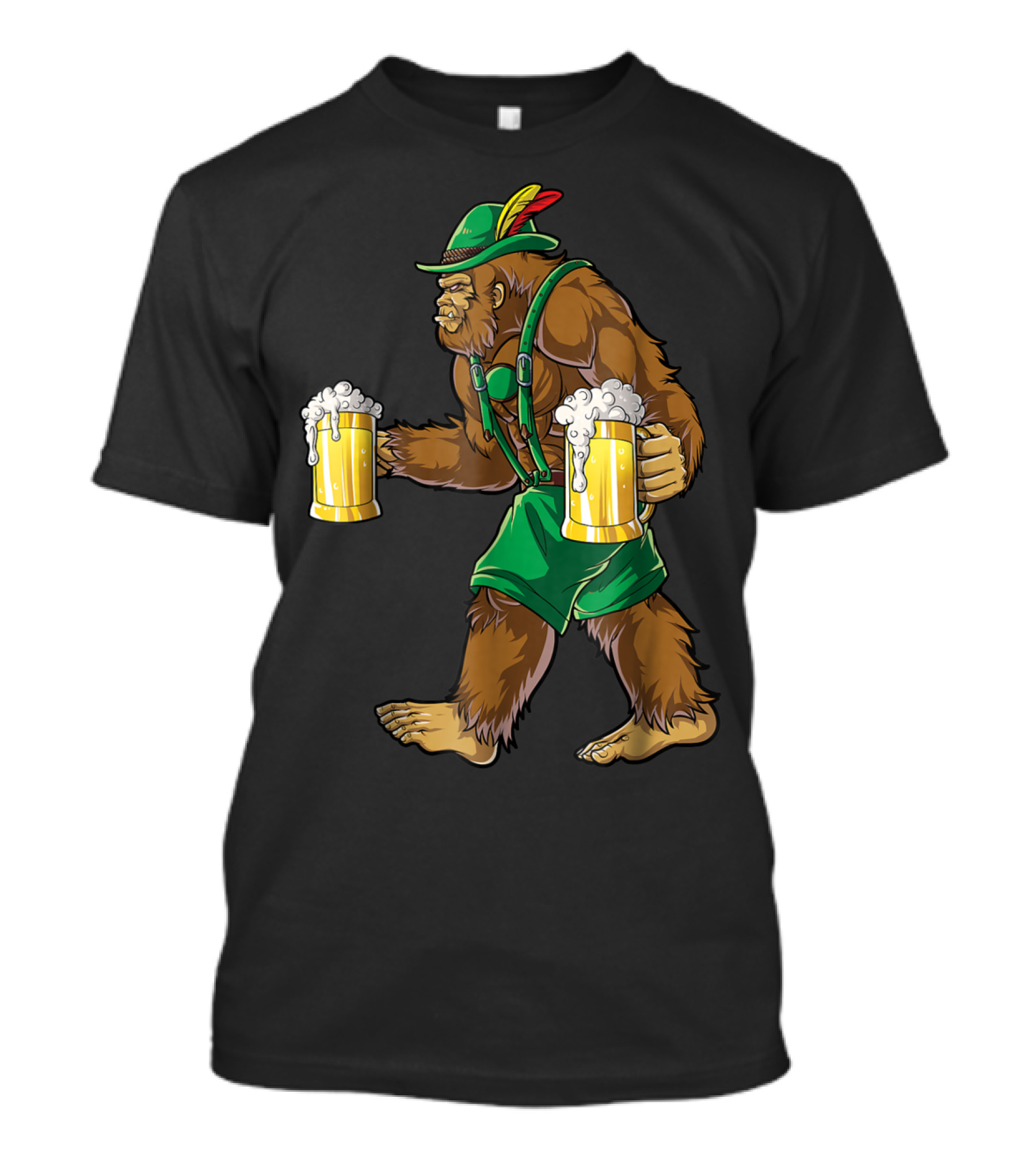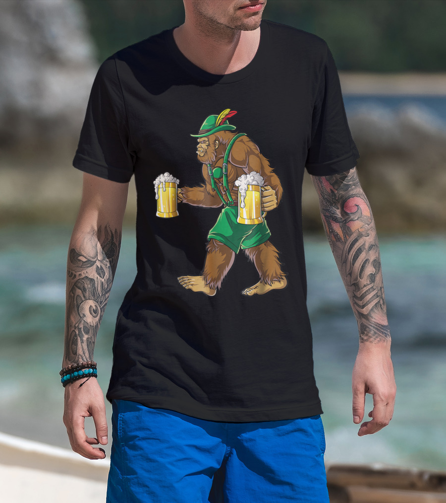 Bigfoot In Lederhosen Oktoberfest Prost Beer With Two Mugs T-Shirt