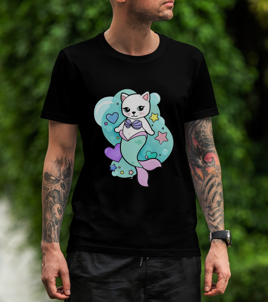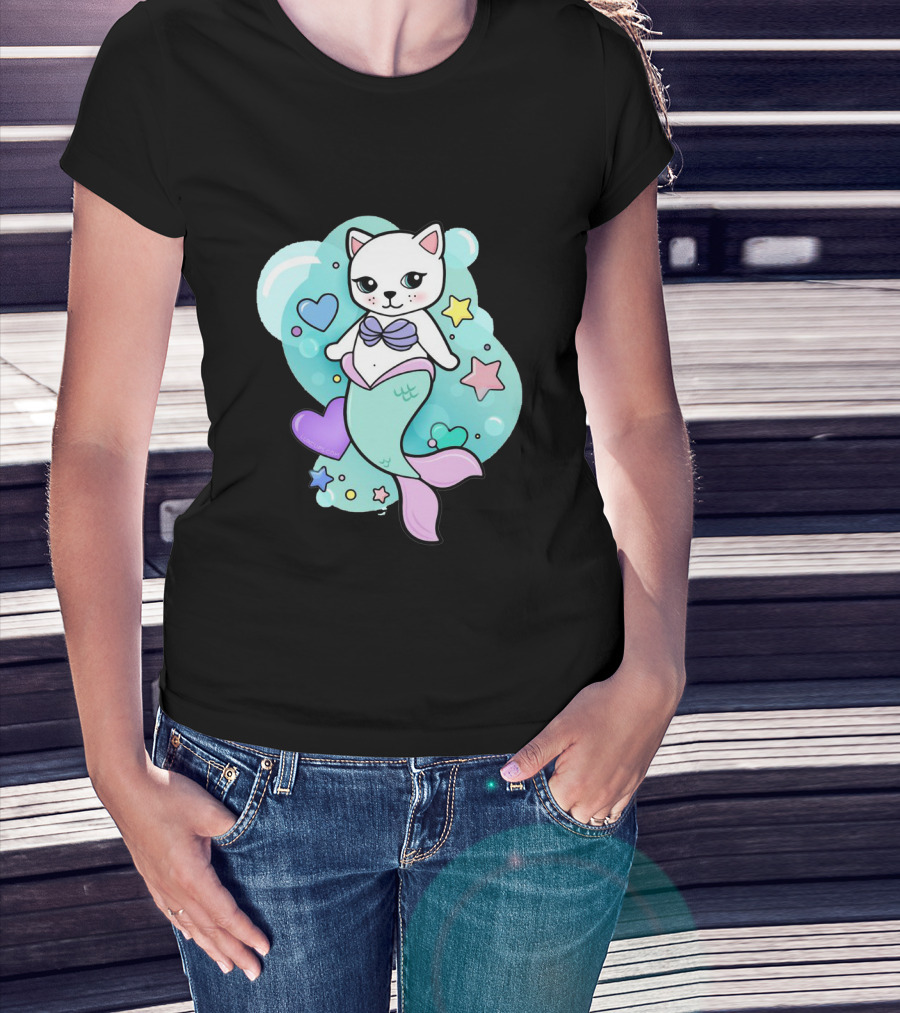 Barbiecore Pretty Purrmaid Pastel Cute Cat Mermaid Bubbles Hearts Stars T-Shirt