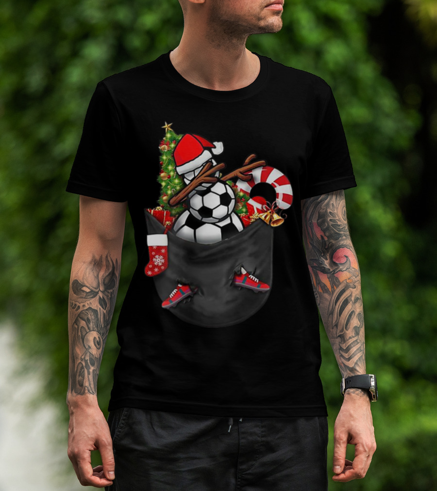 Dabbing Snowman With Soccer Ball And Christmas Decorations In Pocket T-Shirt