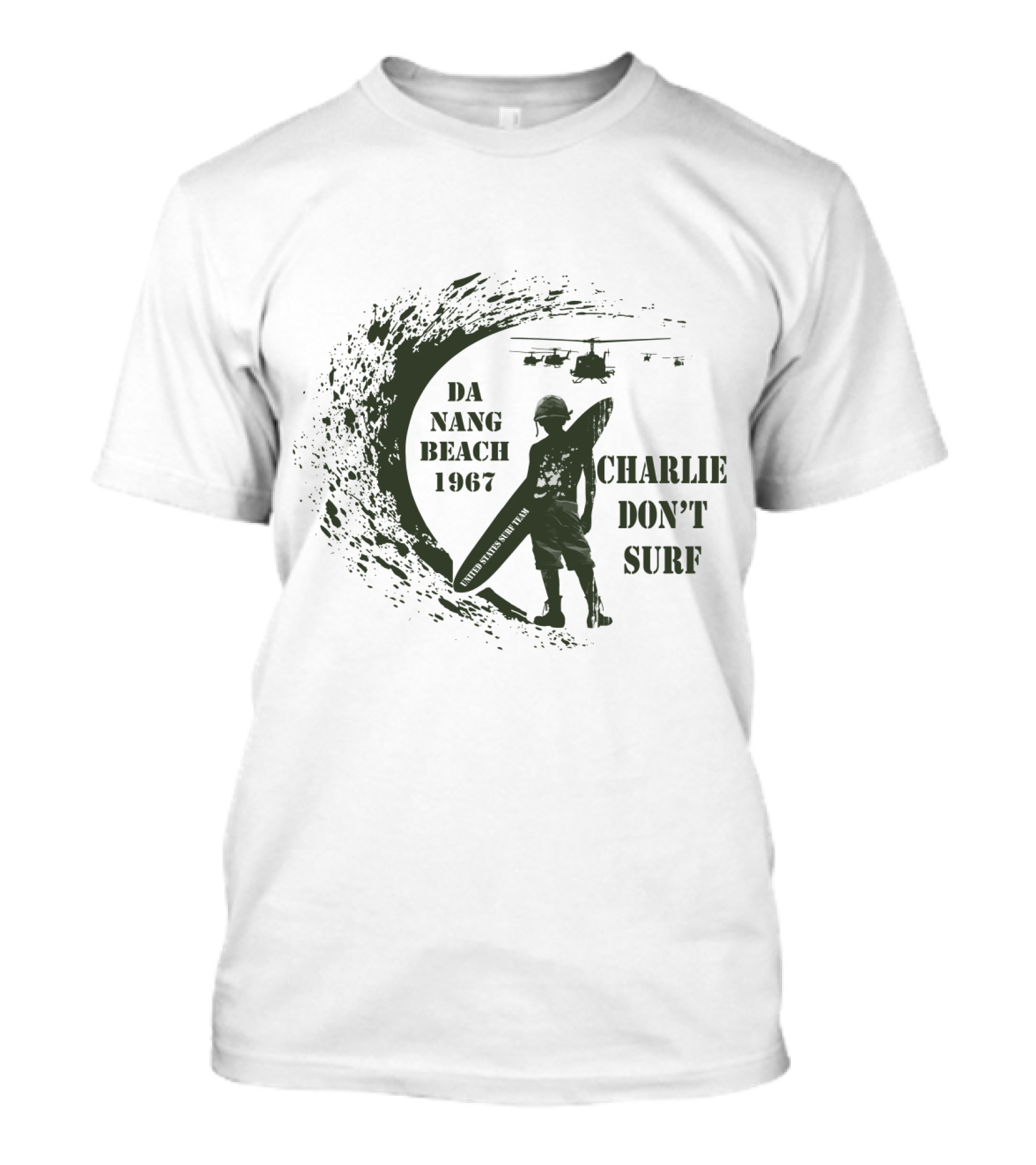 The Da Nang Beach 1967 Charlie Don't Surf Helicopters T-shirt is designed for everyday wear and a consistent fit. Fabric is pre-shrunk ring-spun cotton with durable stitching. See the size chart below for exact measurements.