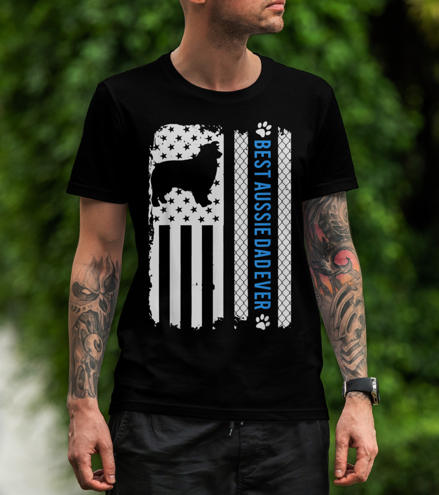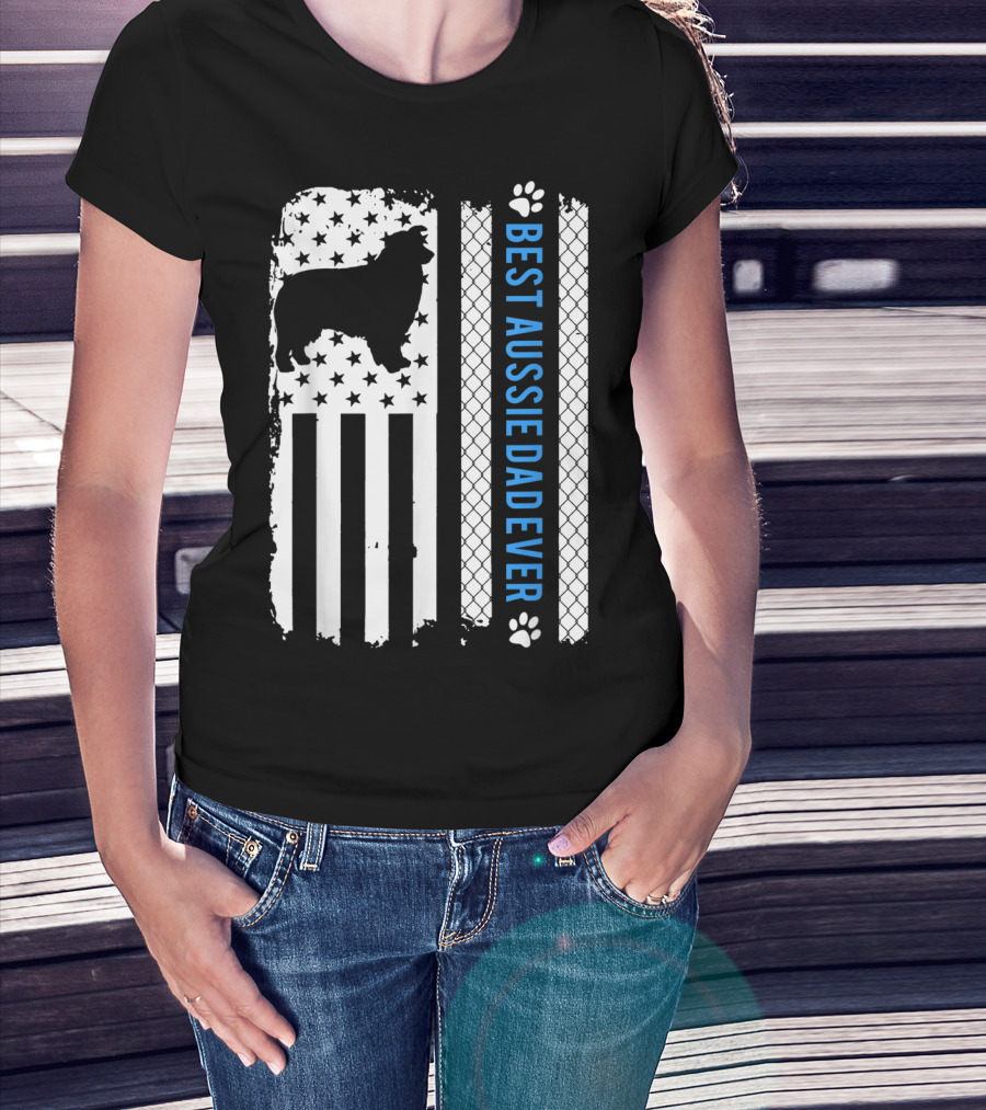 Best Aussie Dad Ever American Flag Dog Silhouette And Paw Prints T-Shirt