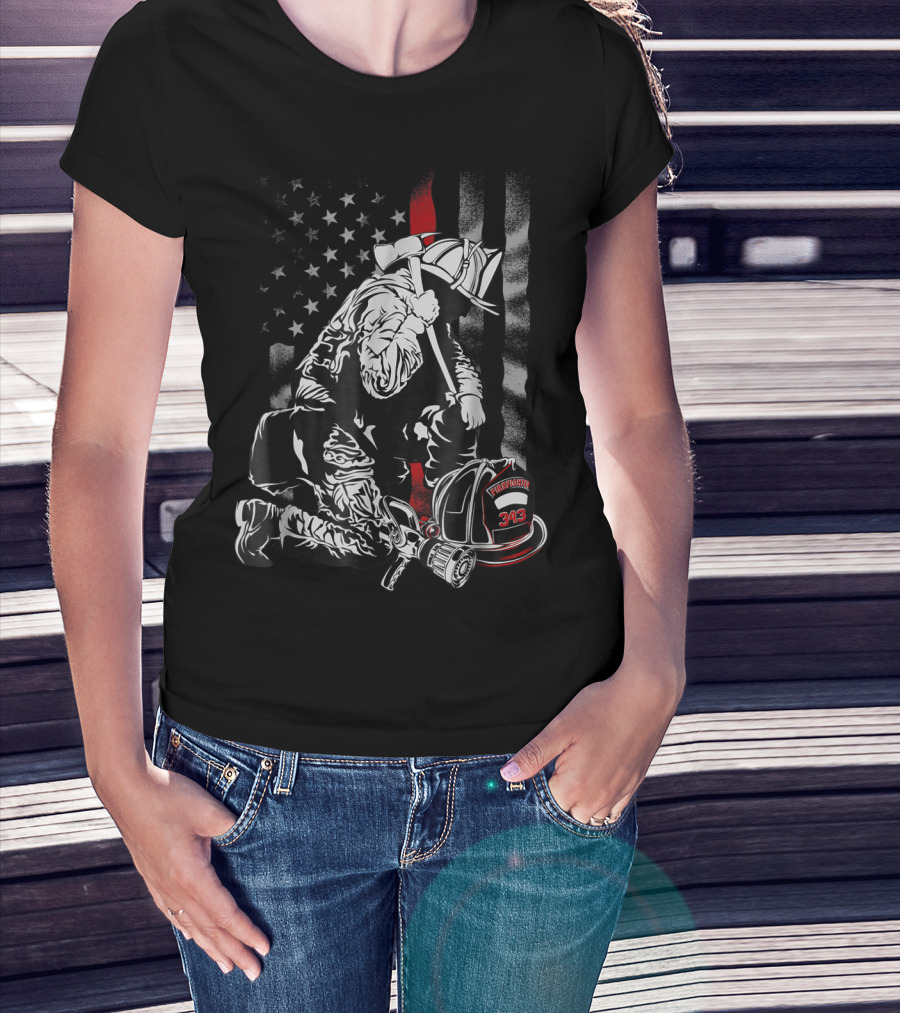 Firefighter Kneeling With Vintage USA Flag And Fire Helmet 343 T-Shirt
