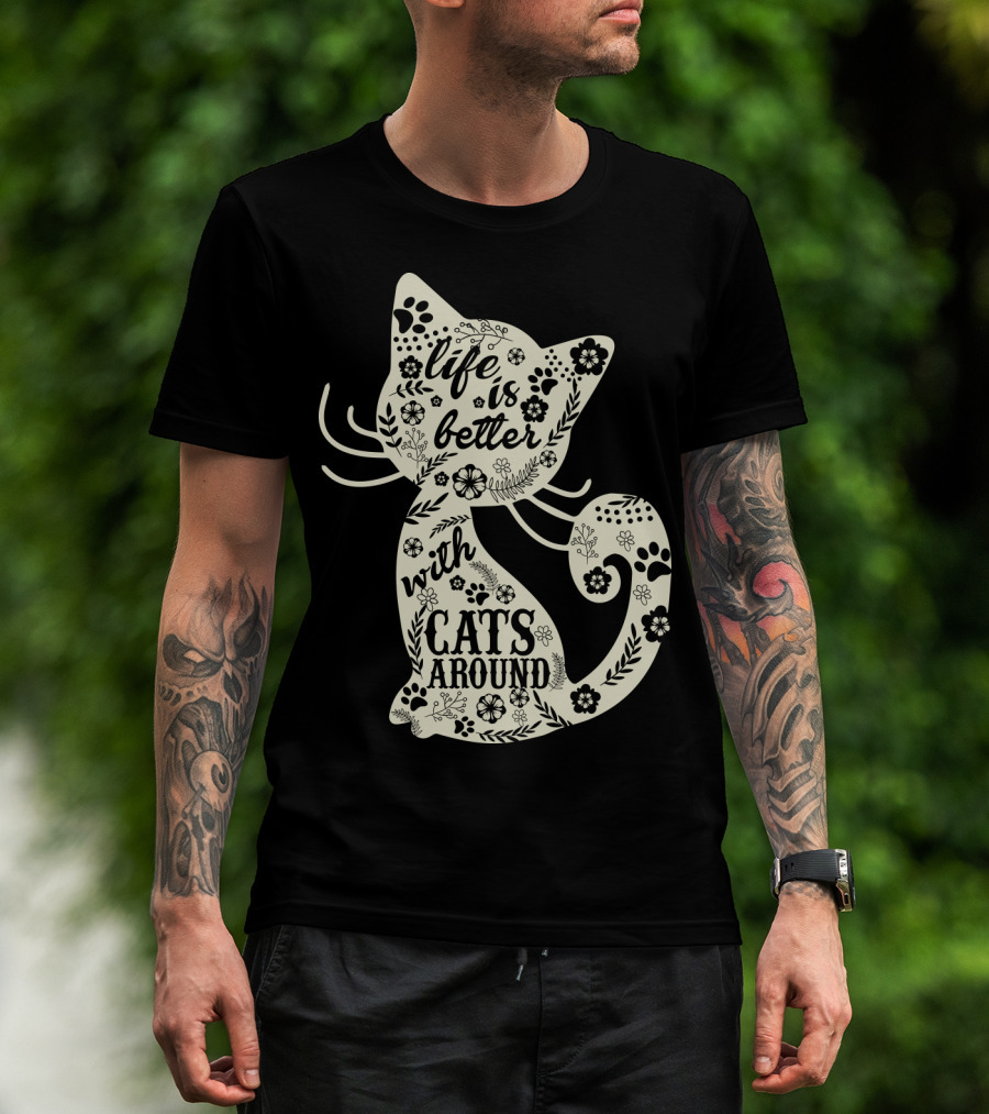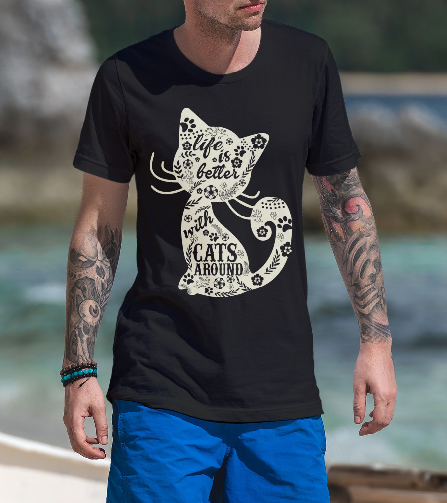 Life Is Better With Cats Around Cat Floral Paw Prints T-Shirt