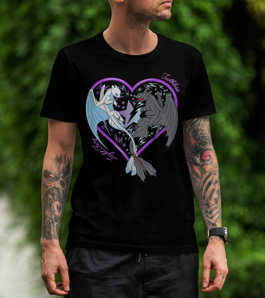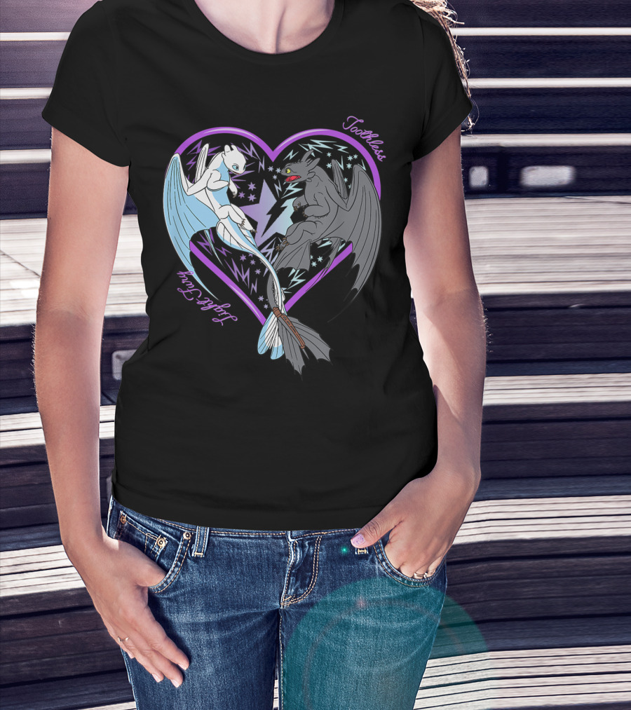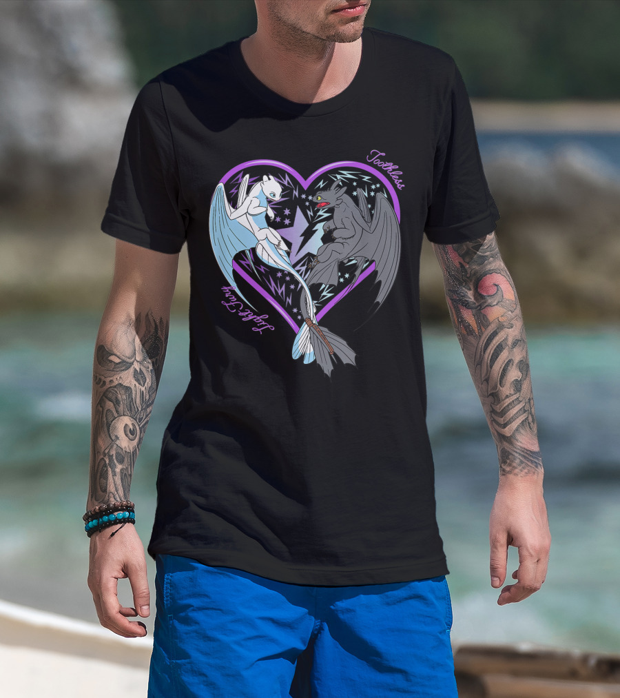 The Toothless and Light Fury Heart Night How to Train Your Dragon 3 Hidden World T-shirt is designed for everyday wear and a consistent fit. Fabric is pre-shrunk ring-spun cotton with durable stitching. See the size chart below for exact measurements.