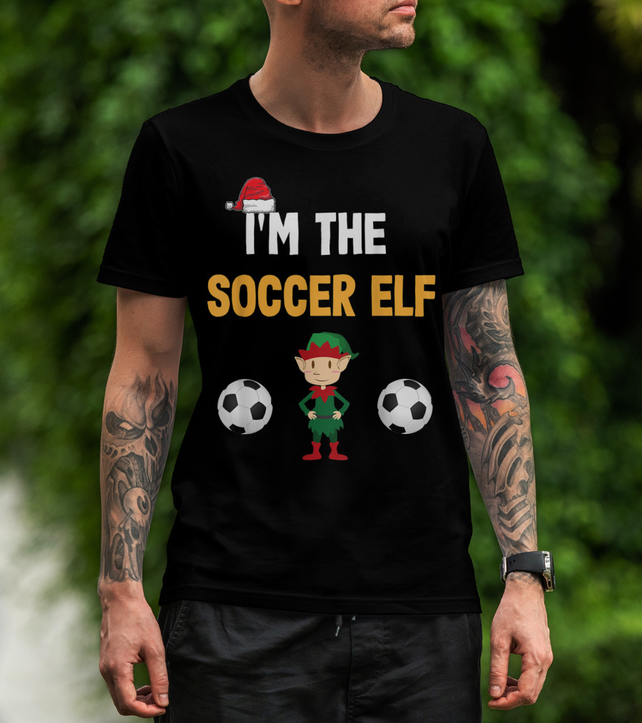 The I'M THE SOCCER ELF Santa Hat Footballs T-shirt is designed for everyday wear and a consistent fit. Fabric is pre-shrunk ring-spun cotton with durable stitching. See the size chart below for exact measurements.