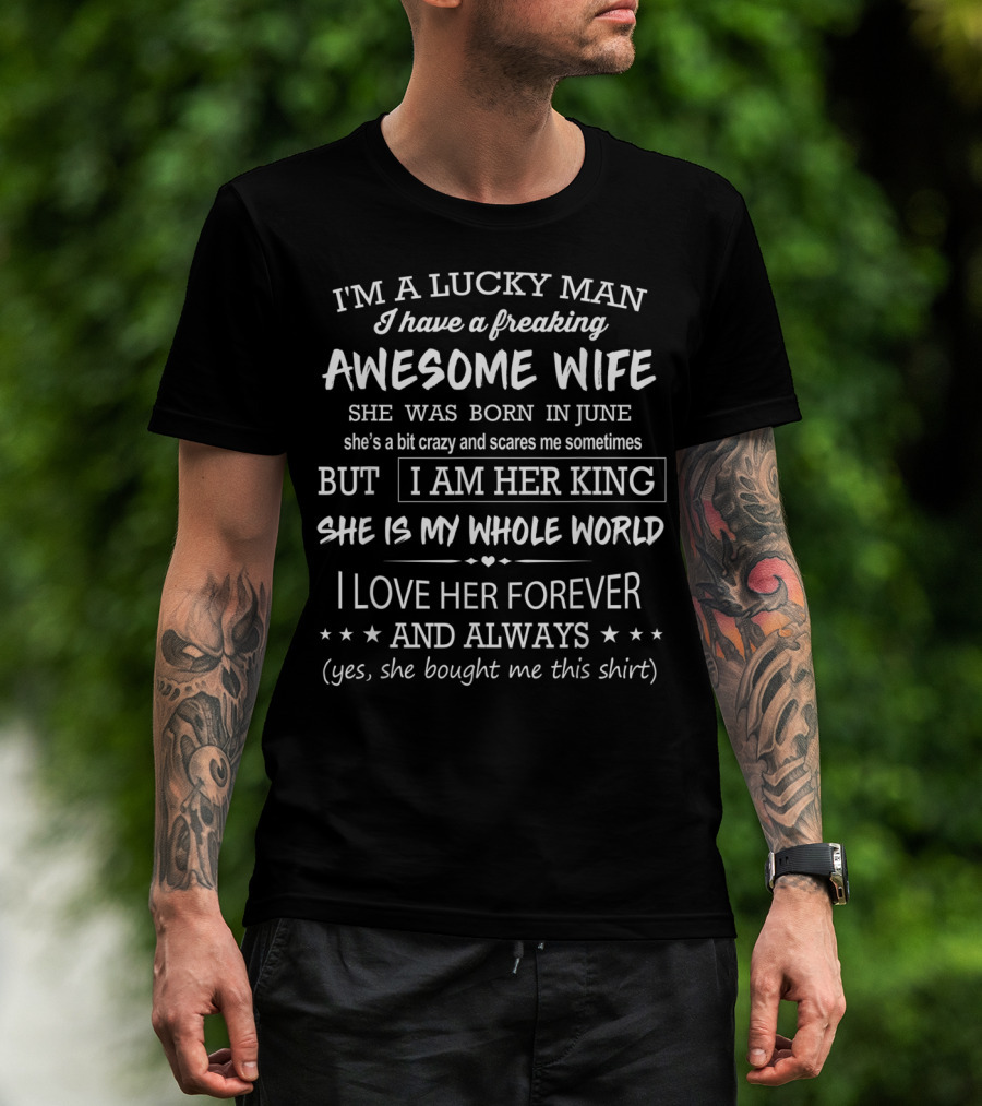 I'm A Lucky Man I Have A Freaking Awesome Wife Born In June She's A Bit Crazy Sometimes But I Am Her King She Is My Whole World I Love Her Forever T-Shirt