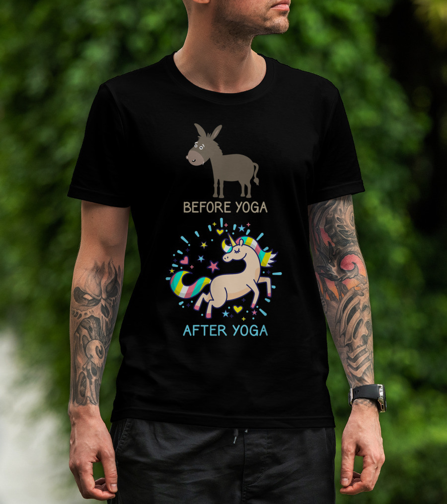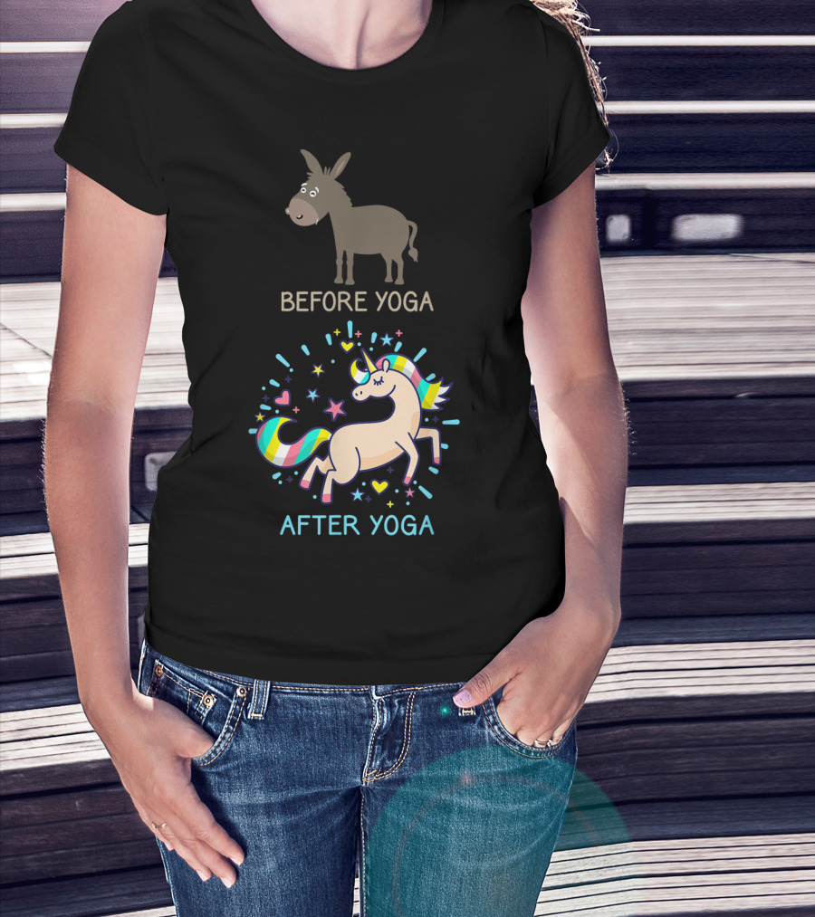 Before Yoga Donkey After Yoga Fantasy Unicorn Transformation T-Shirt